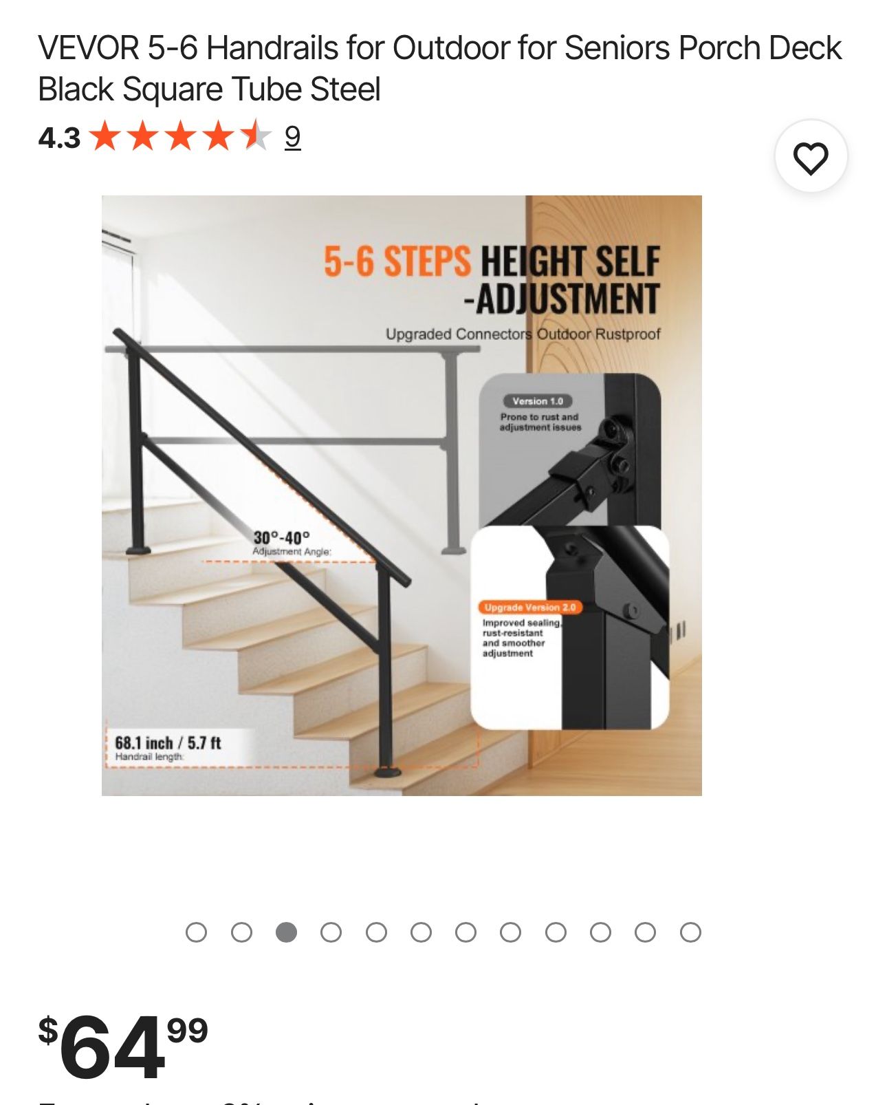 VEVOR 5-6 Handrails for Outdoor for Seniors Porch Deck Black Square Tube Steel $30