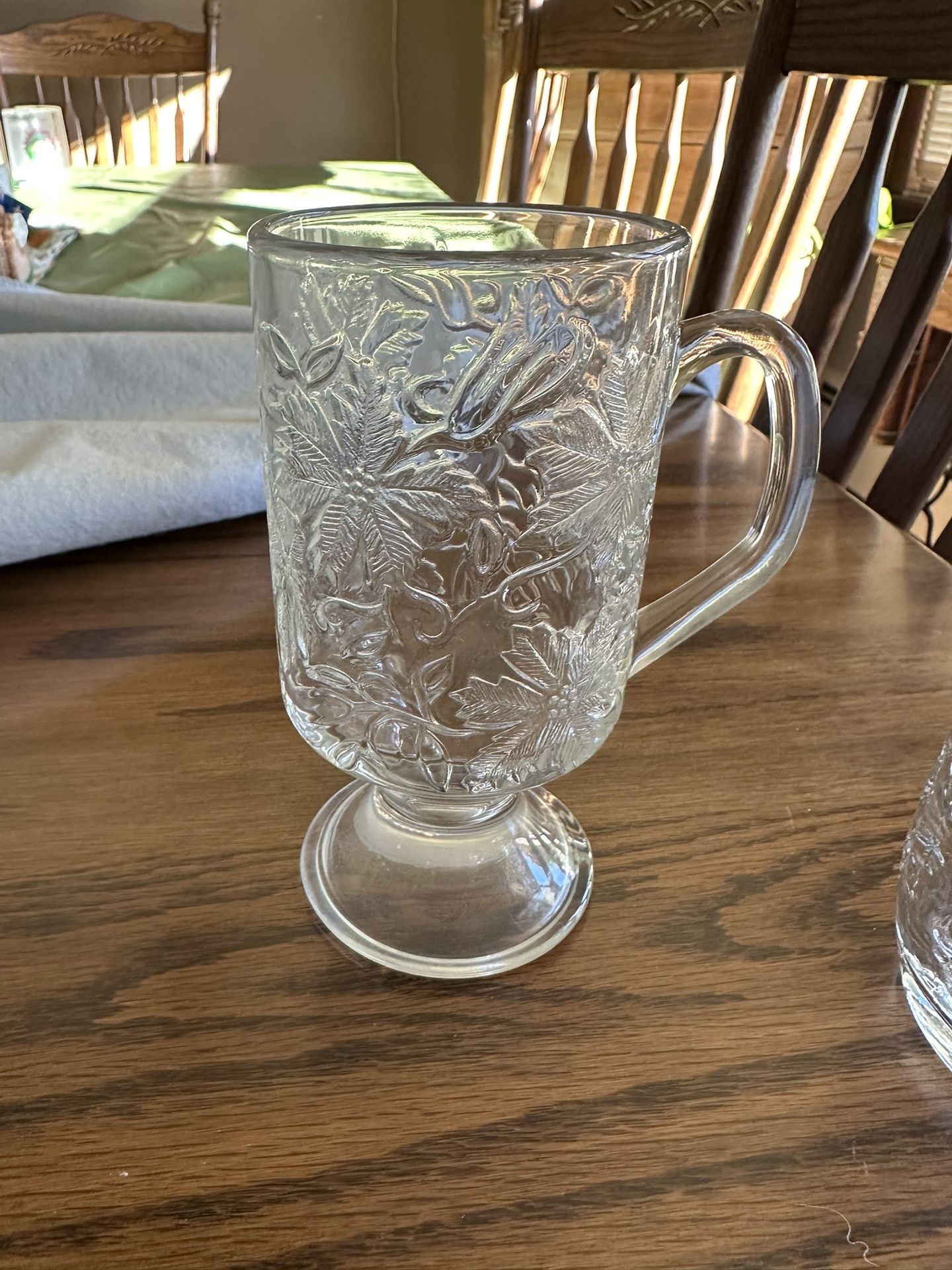 Beautiful set of Vintage Princess House-Fantasia Crystal Poinsetta pattern 12 Footed tall mugs Asking $70 Perfect for everyday use, entertainment and special occasions. Porch pickup Lemont Serious buyers and Cash only Will be posting Separate ads for a 64 pc dinner collection of 16… 10” and 6” plates, bowls, coffee mugs with handles, 2 oval vegetable serving bowls, 2 large salad/ punch bowl, 9x13 rectangle baking dishes, deep dish baker, gravy boat, cream and sugar,