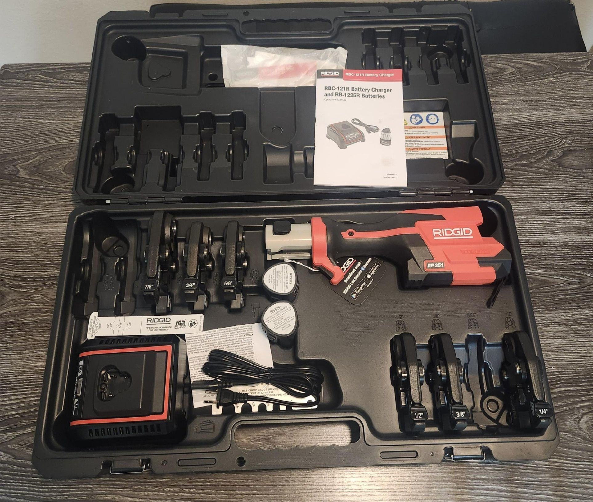 RP 251 Stainless Steel Press Tool Kit Includes 6-RLS Jaws (1/4 in. - 7/8 in.), 2-12V Batteries, Charger Plus Case New, never used. 78248 Willing to deliver with 50 miles