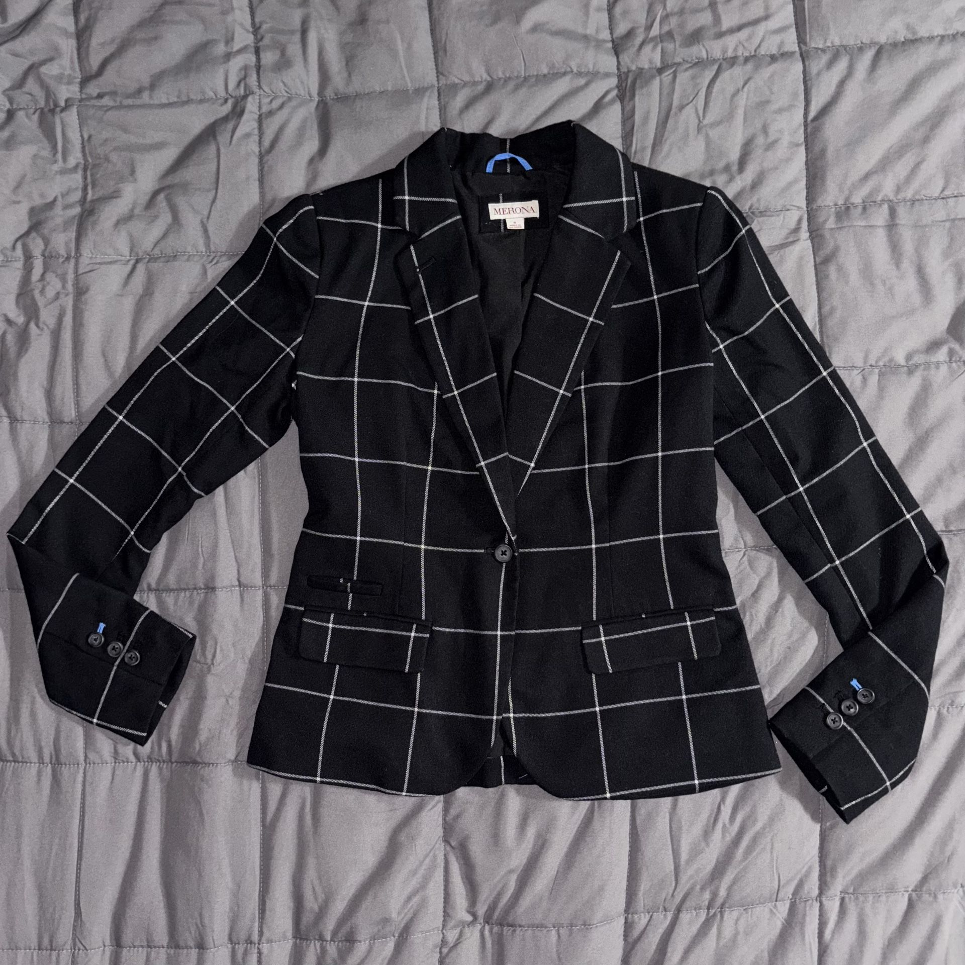 Stylish Merona women’s blazer in size 6 featuring a black windowpane pattern. Blue accents give it a little flare. Shell is 70% polyester, 25% rayon, 3% wool, and 2% spandex for light stretch and comfort. Fully lined with 100% polyester. Single-button front, notched lapel, and faux pockets. Great for work, business casual, or everyday layering. New without tags. Form flattering. Light shoulder padding for comfort.