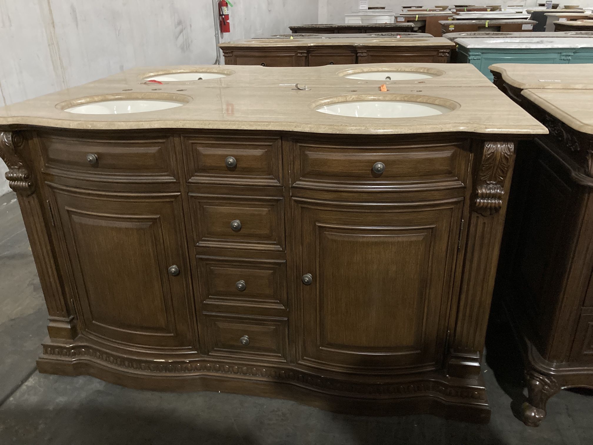 60” x 22” x 36”H New open box; never used with minor paint touch up Natural travertine stone top Pre-drilled for 3-hole faucet (faucet not included) Solid wood structure with CARB Ph2 certified panels All purchases need to be picked up from our showroom. We will help loading your purchase to your vehicle (with shrink wrap and styrofoam, if needed) Just bring your own straps, if needed.