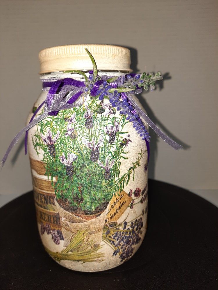 Beautiful decoupaged quart-sized mason jar featuring a basket of lavender. This jar has a string of fairy lights inside that have 3 settings. (Rapid blink, slow blink, and steady on). The light control switch is glued to the inside of the lid for easy access and battery changes. A great decorative piece for spring, giving that French country vibe! Be sure to check out my other listings, and thank you for stopping by. Blessed be!