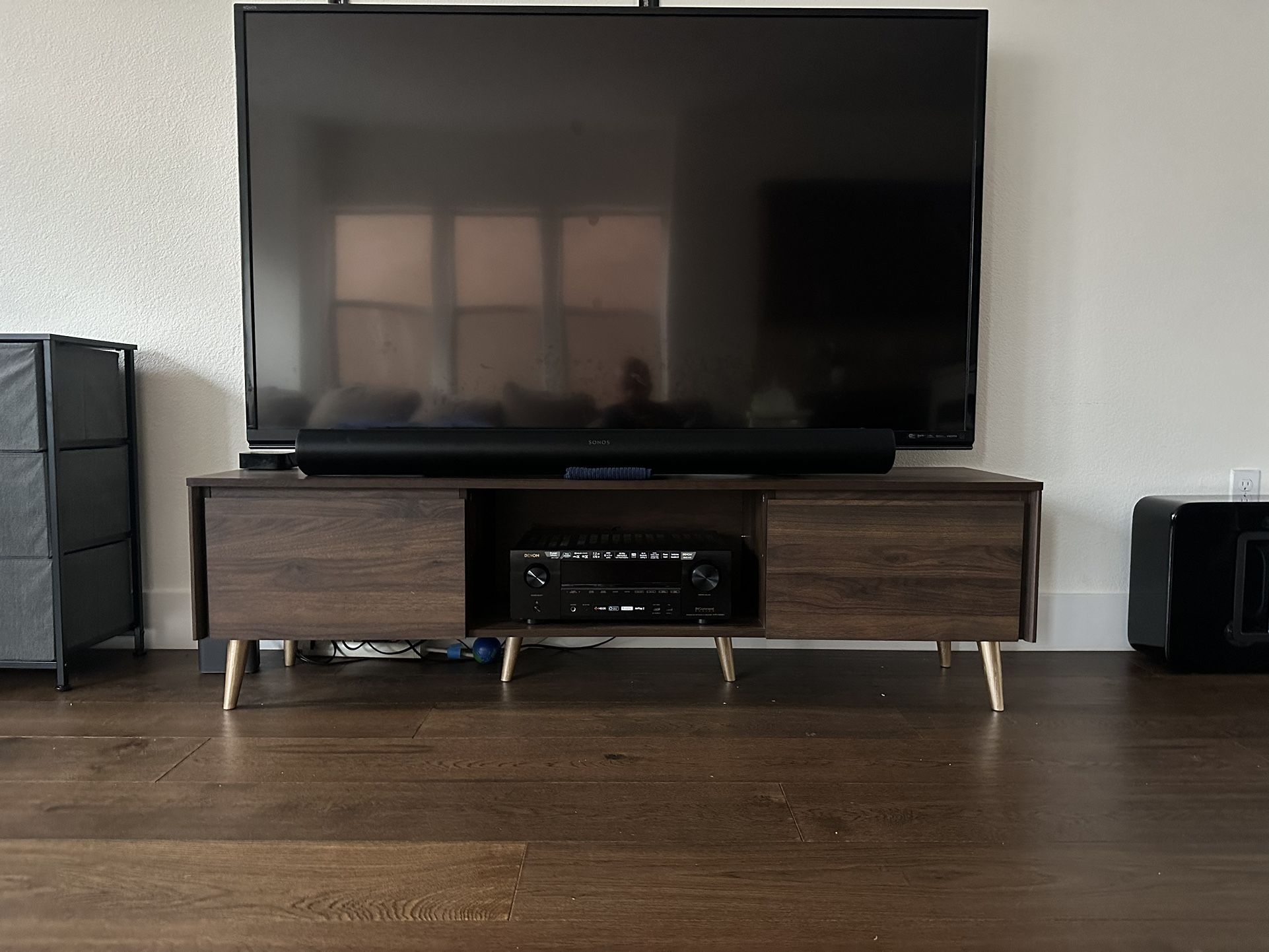 Great tv stand, nice colors. Normal wear and tear from placing TV on top of the stand. See description from Wayfair.
