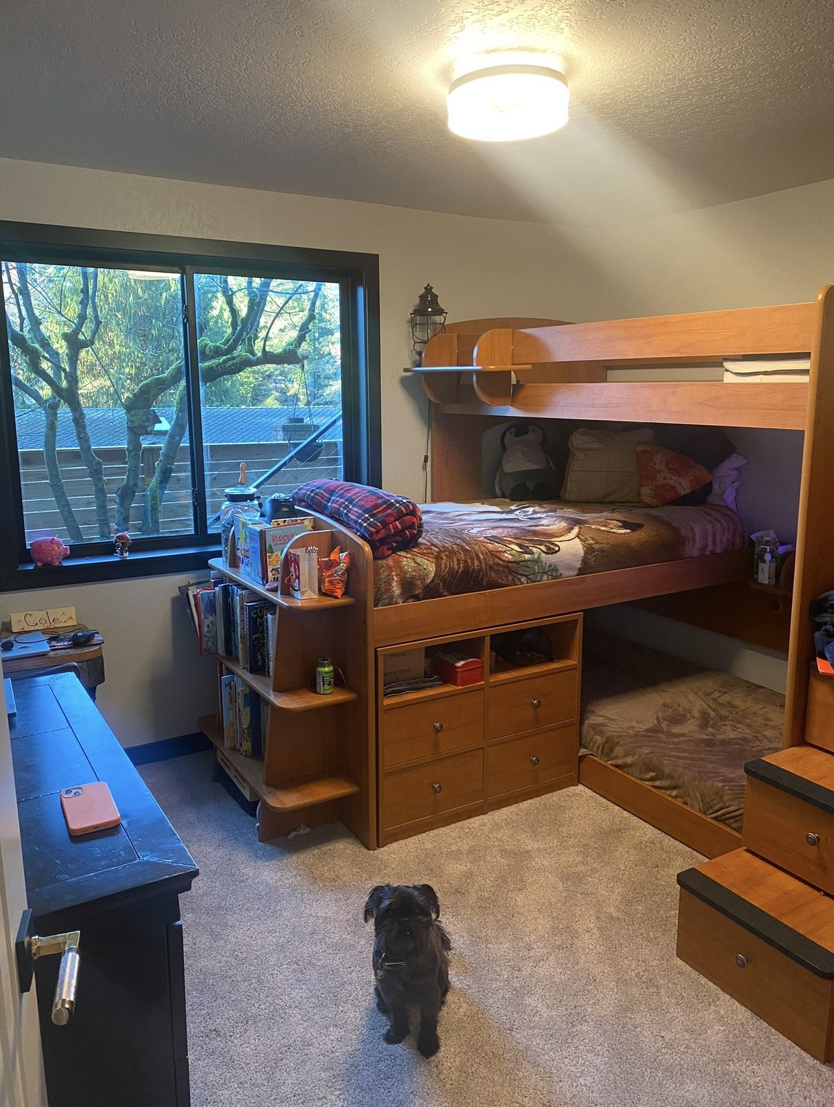 Triple Bunk bed for sale. One screw is stripped (lock-tight tape recommended when reassembled), but otherwise in excellent condition! Sturdy! No squeaks or rattles. High quality. Must take apart and haul away. Happy to help if it works out, but bring your own tools. Mine suck. $500 OBO.