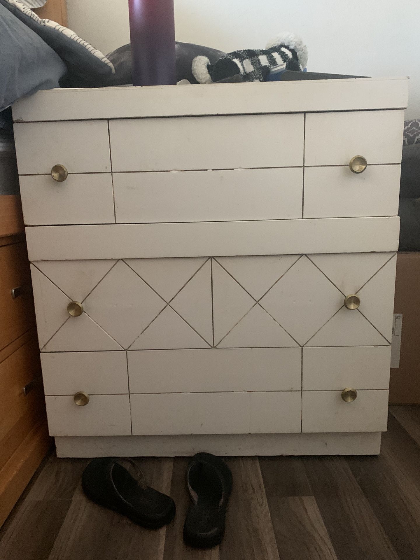 29” W x 17” D x 31 1/2” T 2 white vintage mid-century modern nightstands with gold pulls. Deep drawers, lots of storage. Located in SE Visalia. Porch pick up only, no delivery available. Must be able to load and transport yourself. Will not fit in an SUV, need a truck. Accepts cash, Zelle and Venmo. Moving 1/26 $20 OBO
