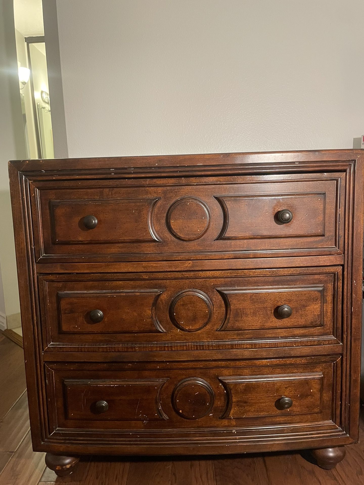 Depth 19” Height 34” Width 34” Crafted of solid wood Sturdy construction that is extremely rare these days Dovetail drawers for superior durability and aesthetics Solid wood dust panels to prevent dust getting into contents and to support the dresser’s structure Original hardware No cheap MDF veneers, all solid wood A few dings/scratches but great structural integrity and overall condition Clean, non-smoking home