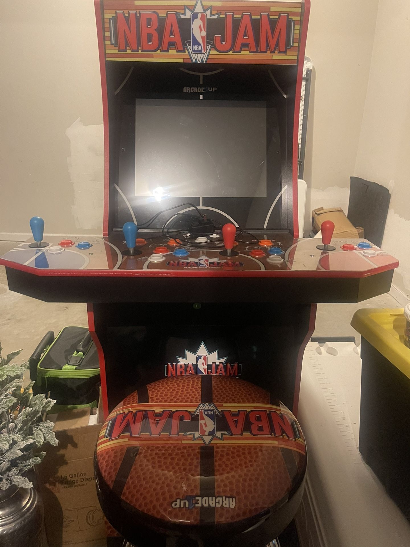 STRAIGHT FROM THE ARCADE: Authentically licensed reproduction NBA Jame arcade cabinet; Anti-tip over strap keeps the machine upright while you play 3 GAMES, 1 MACHINE: Includes 3 games in 1, providing endless 1-vs-1 or 2-vs-2 competition in a single device WI-FI ENABLED TOURNAMENTS: Live wi-fi-enabled cabinet lets you challenge opponents worldwide with no monthly subscription NO QUARTERS NEEDED: Coinless operation and real-feel controls transform your home into a real-life arcade; Overall dimensions (W x H x D): 31 x 57.8 x 22.75 inches; Weight: 88 pounds AUTHENTIC LOOK: Classic design features a light-up marquee, 17-inch screen, and original reproduction graphics of the NBA Jam cabinet and controls