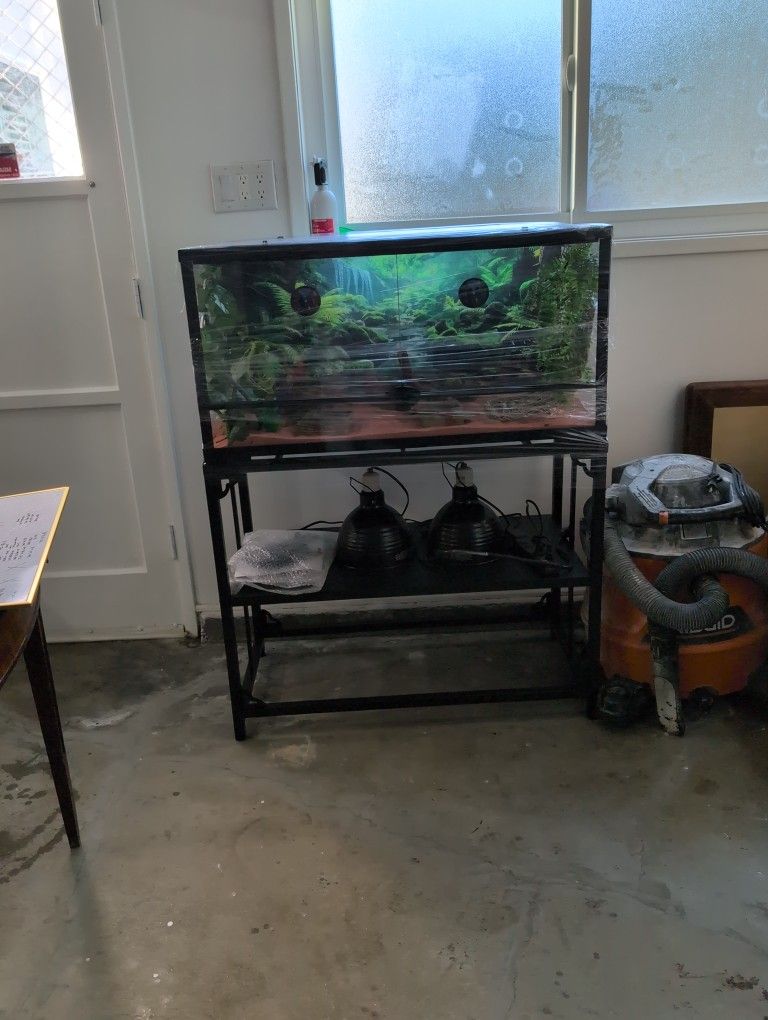 40 gallon enclosure 2 thermometer Calcium sand Decoration hammock 2 lamps Feeding bowl Stand All brand new except the lid for the enclosure is damaged on one end. Still works All in all I spent 450 bucks. I'll take $225