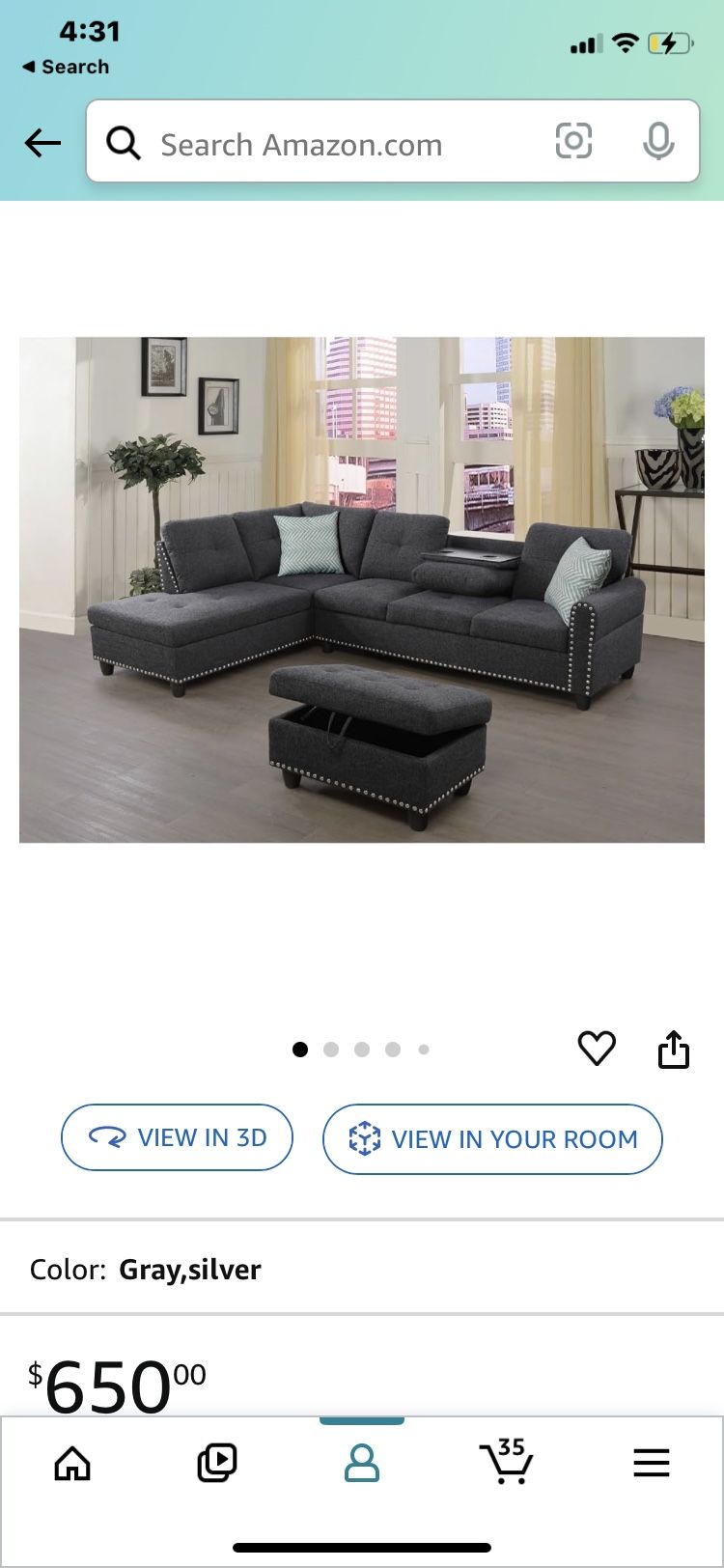 Convertible Sectional Sofa with Storage, 4 Seat L Shaped Couch with Chaise and Cup Holder, ottoman, Modern Linen Fabric Sofá for Living Room, Apartment, Office (Dark Gray). In box.