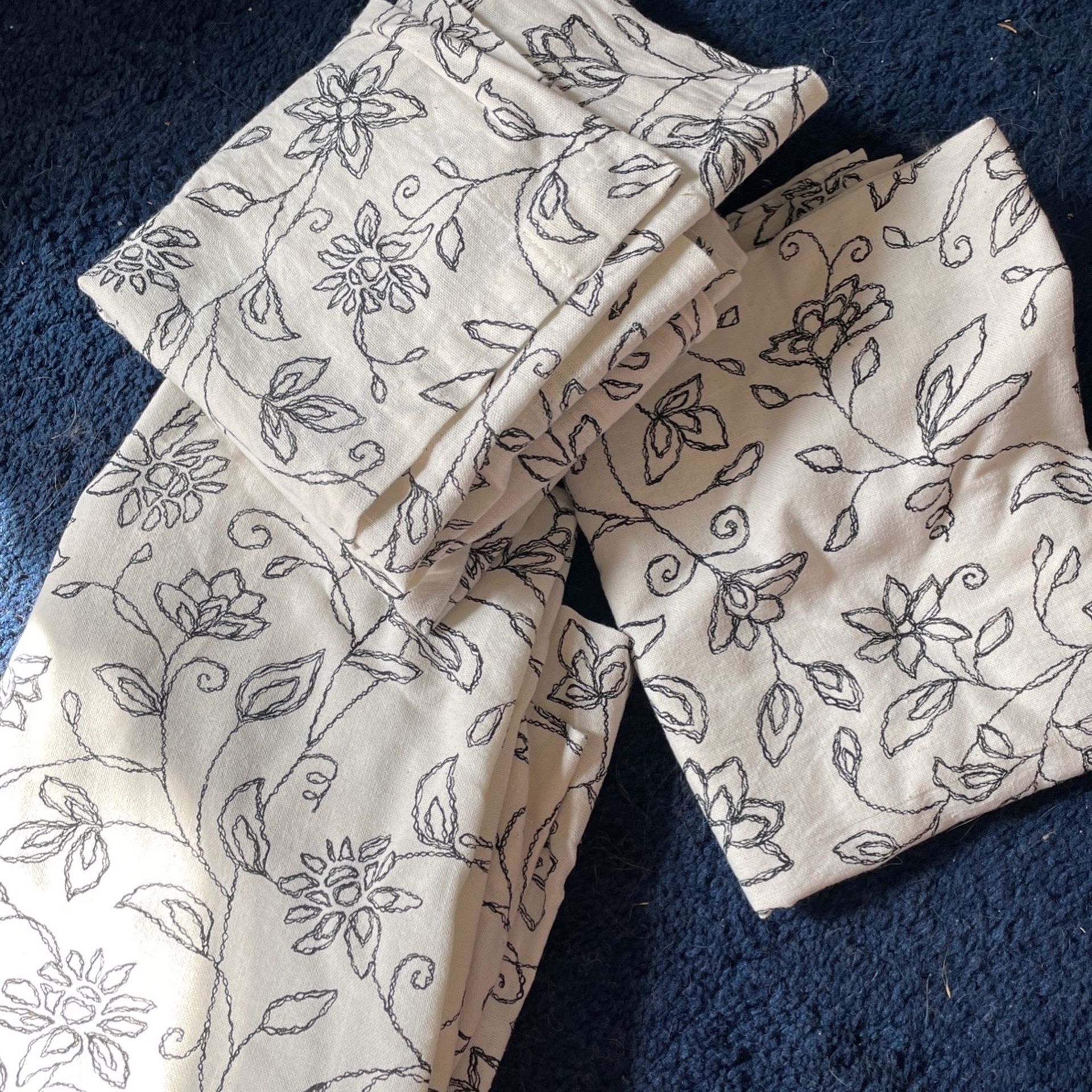 Two wide curtains and a long curtain accent for the top. Offwhite background and black floral pattern.
