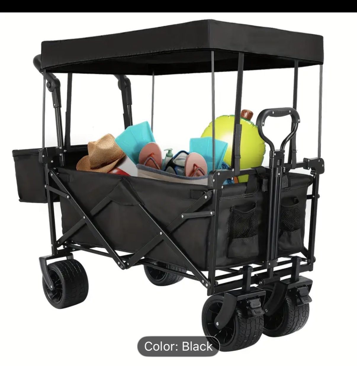 Grey and black all terrain wagon, has attachable storage on the back and a great canopy, BRAND NEW JUST TAKEN OUT OF THE BOX!