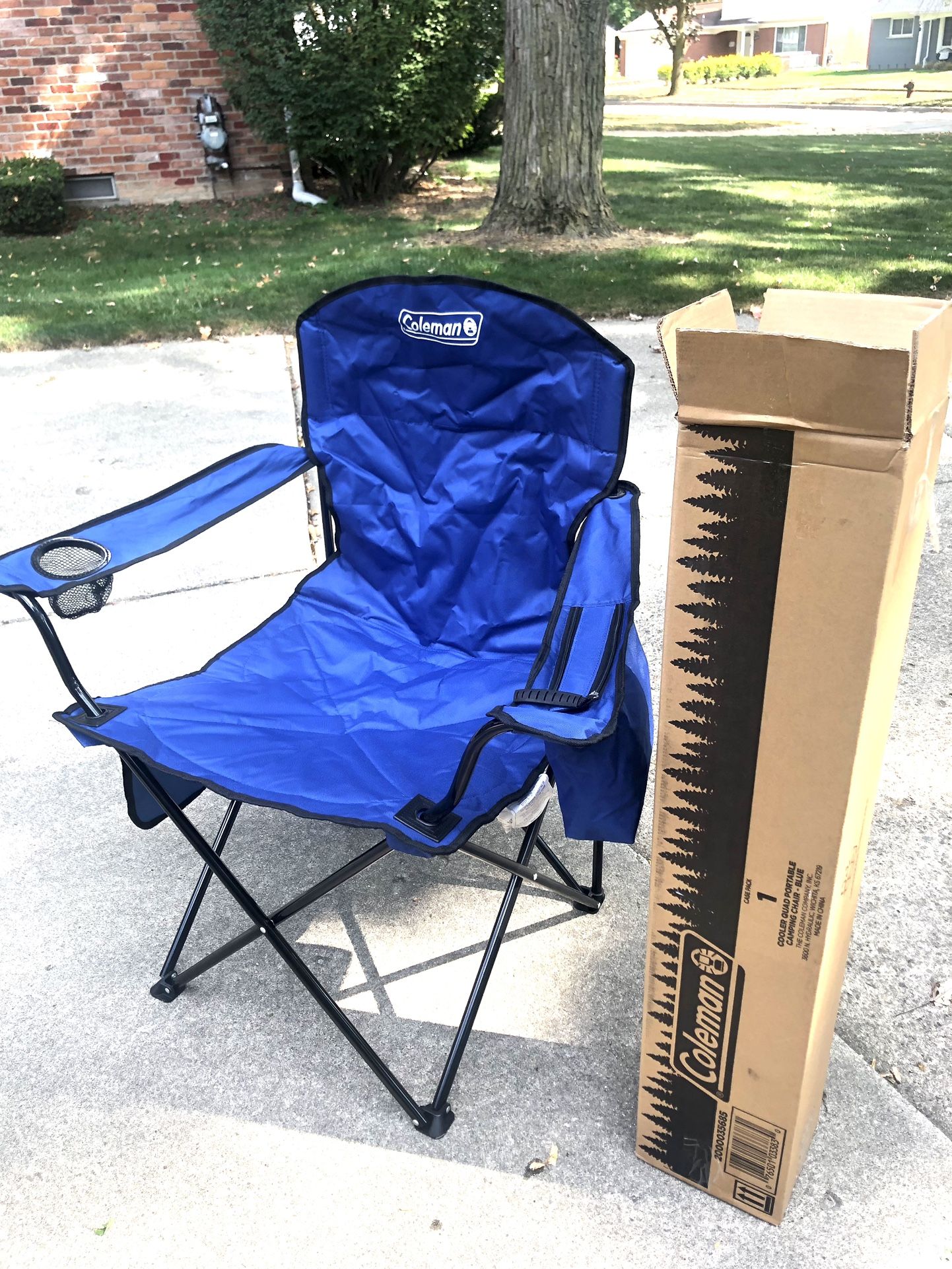 Coleman Cooler Quad Portable Blue Camping Chair Without Carrying Bag Chair is new /never used. Does NOT have a carrying bag so selling for less than half price Seat width 24” Built in cooler holds 4 cans Side storage pocket Mesh cup holder Steel frame See photos for item description Purchased from Coleman for $47 Sale is cash only Meet near 13 mile and Southfield rd at Beverly Hills Police Dept. 18600 W 13 Mile Rd Beverly Hills, MI 48025 They have designated monitored parking spaces on the east side of the building.