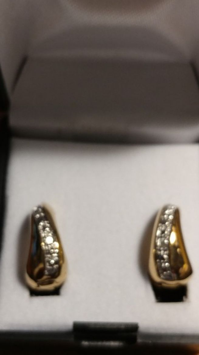 Gold Plated Silver Pierced Earrings w Pave Diamond, safety clasp, gift box. $58.00 cash or PayPal