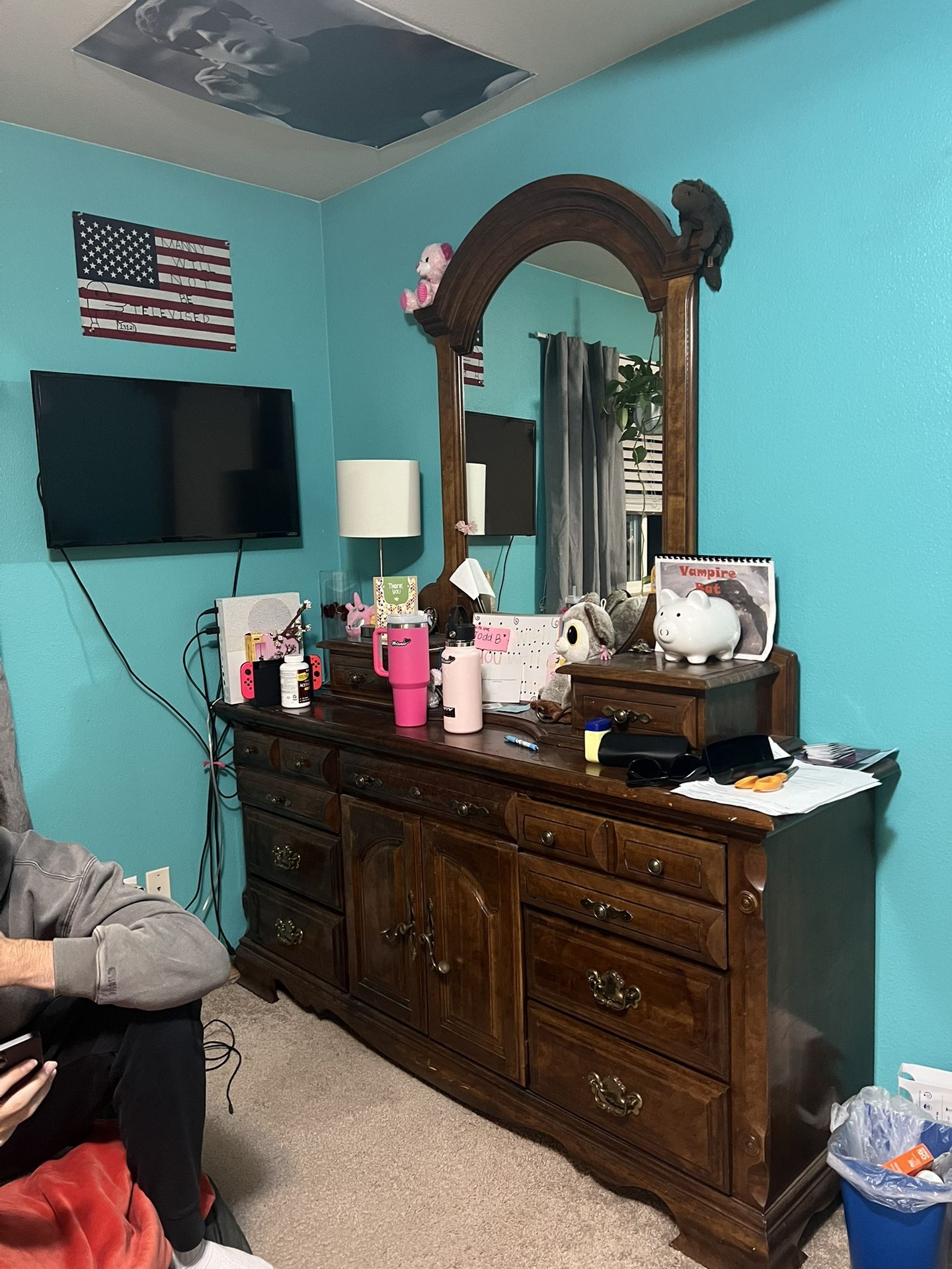 It’s super solid, pretty heavy, and just takes up too much space. It’s got 10 drawers (including 3 hidden behind the middle doors) and a mirror that’s a separate piece, so you can use it with or without. It’s still in good condition and has a lot of life left. Perfect if you need a ton of storage! Would definitely need some help to remove it. Also, obviously recommending a larger vehicle for transporting😅