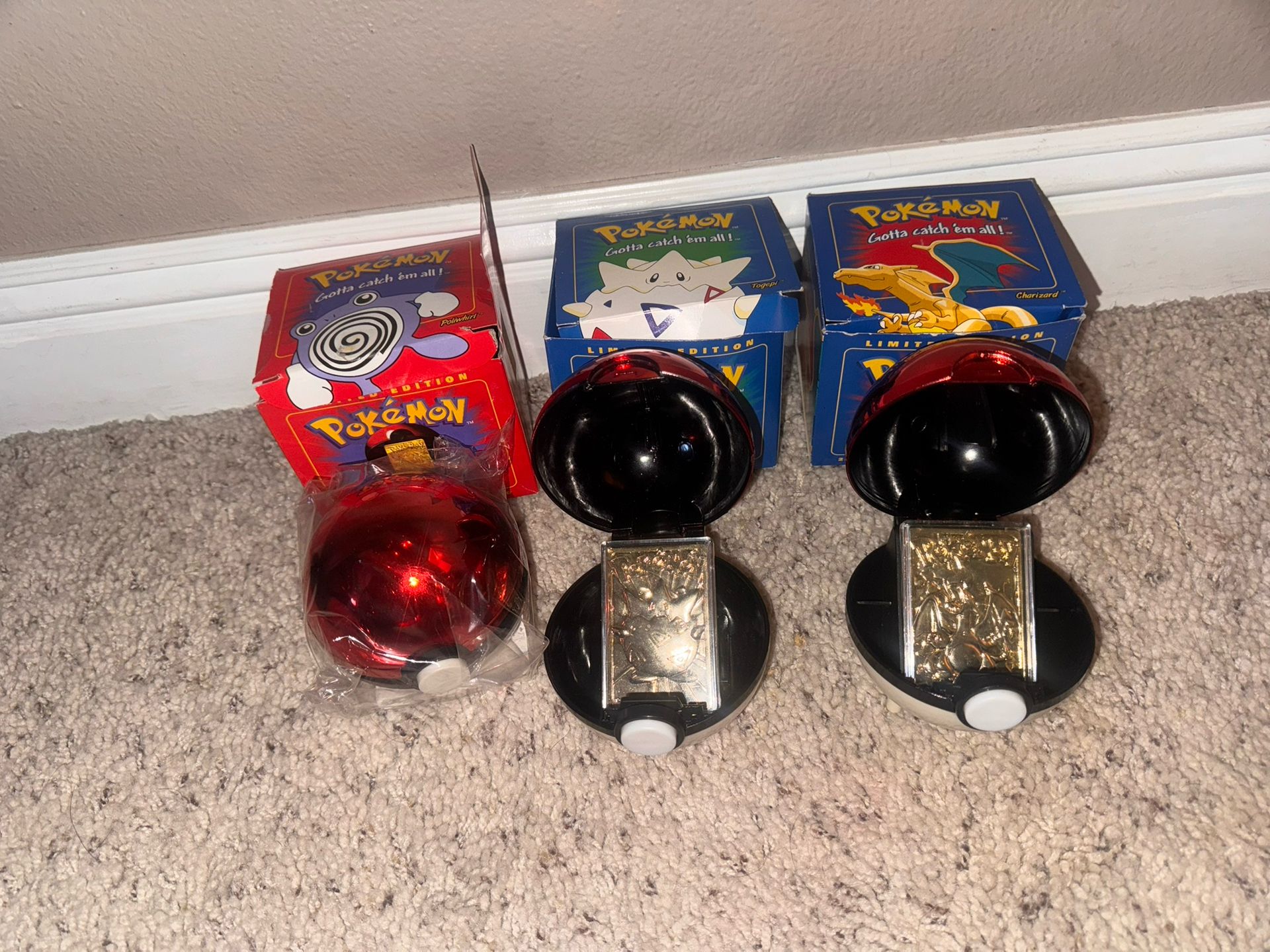 23k Gold Plated Charizard : $300$ 23k Gold Plated Togepi+ certification : $300$ 23k Gold Plated Poliwhirl in wrapping: $350.$ Boxes aren’t to bad they are old but the Pokémonballs are in good shape and cards are perfect!