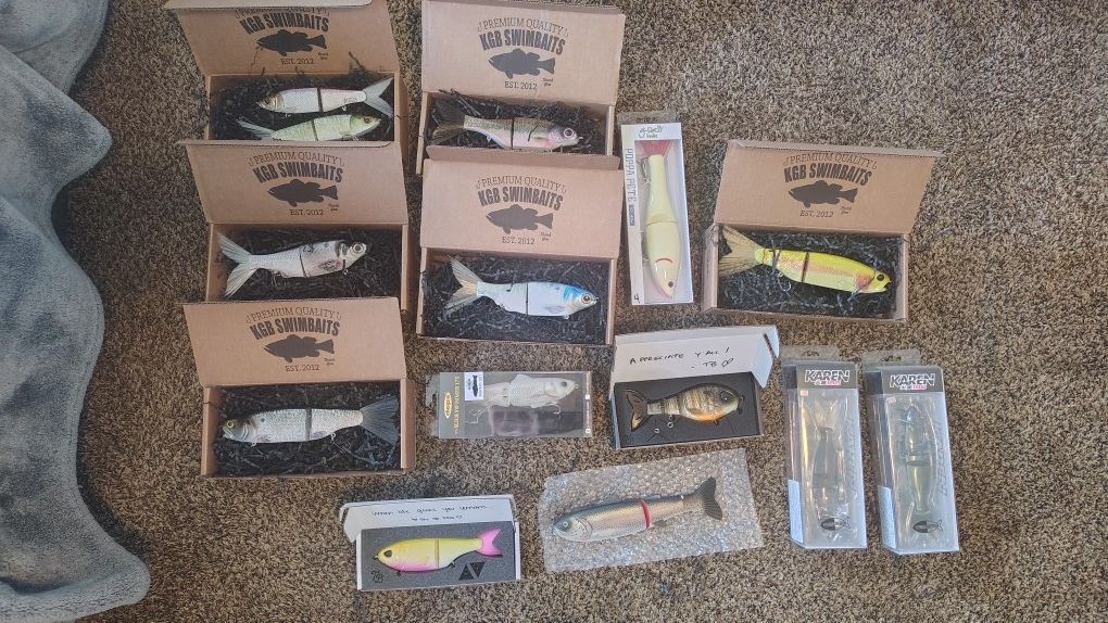 KGB, Throwback, Deps, Baitinsanity, G-Ratt, OSP swimbait lot. Willing to sell all 14 baits (never rigged or used) for $1,000. These baits have been collecting dust in my closet. Easily could resale and make money if you're into that.