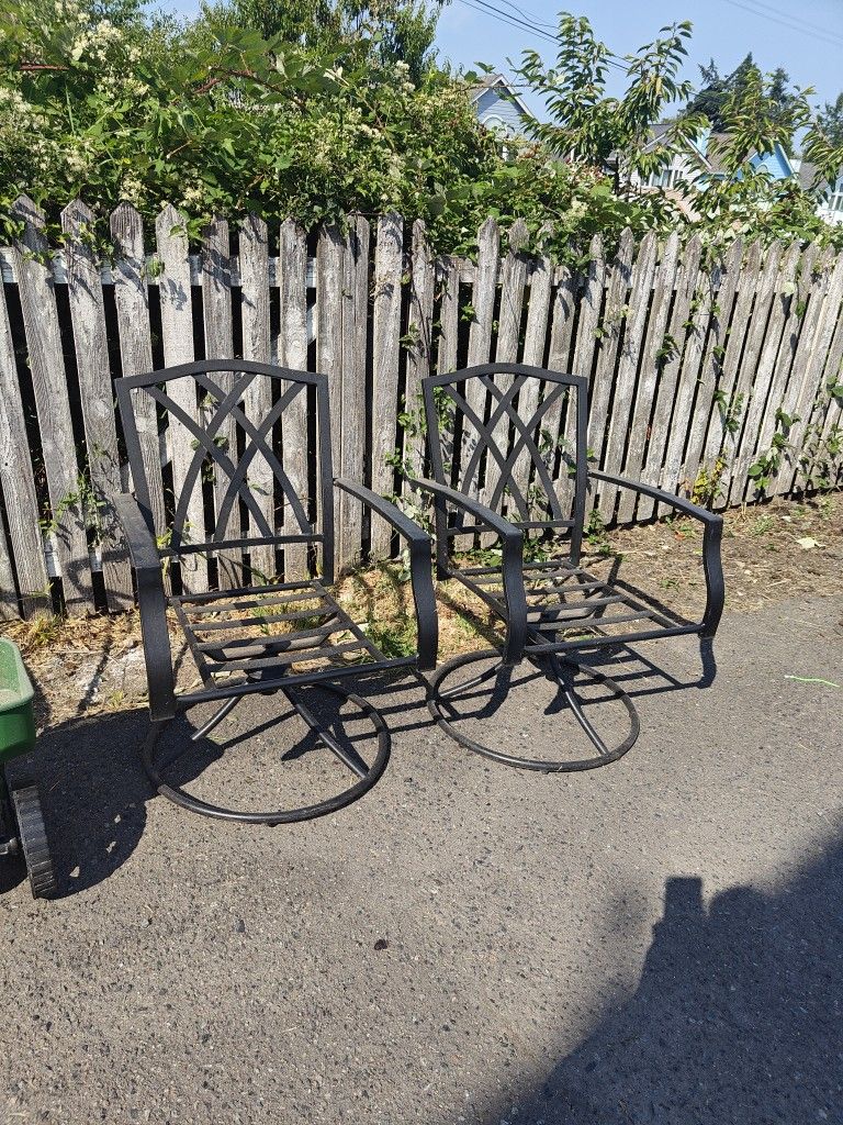 4 stationary chairs 2 swivel chairs Glass table Black metal with glass top. Dirty but in good condition. Cushions not included. Must pick up in Rainier Valley Serious offers only Must buy full set