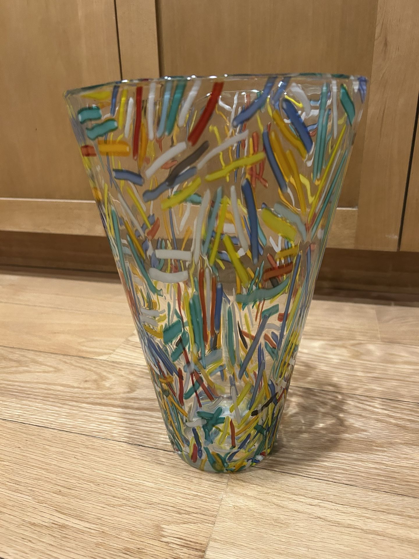 Crate & Barrel Rio confetti glass flower vase. It is an excellent condition. It measures 12 inches tall by 8 1/8 inches wide. $30 cash and pick up only.