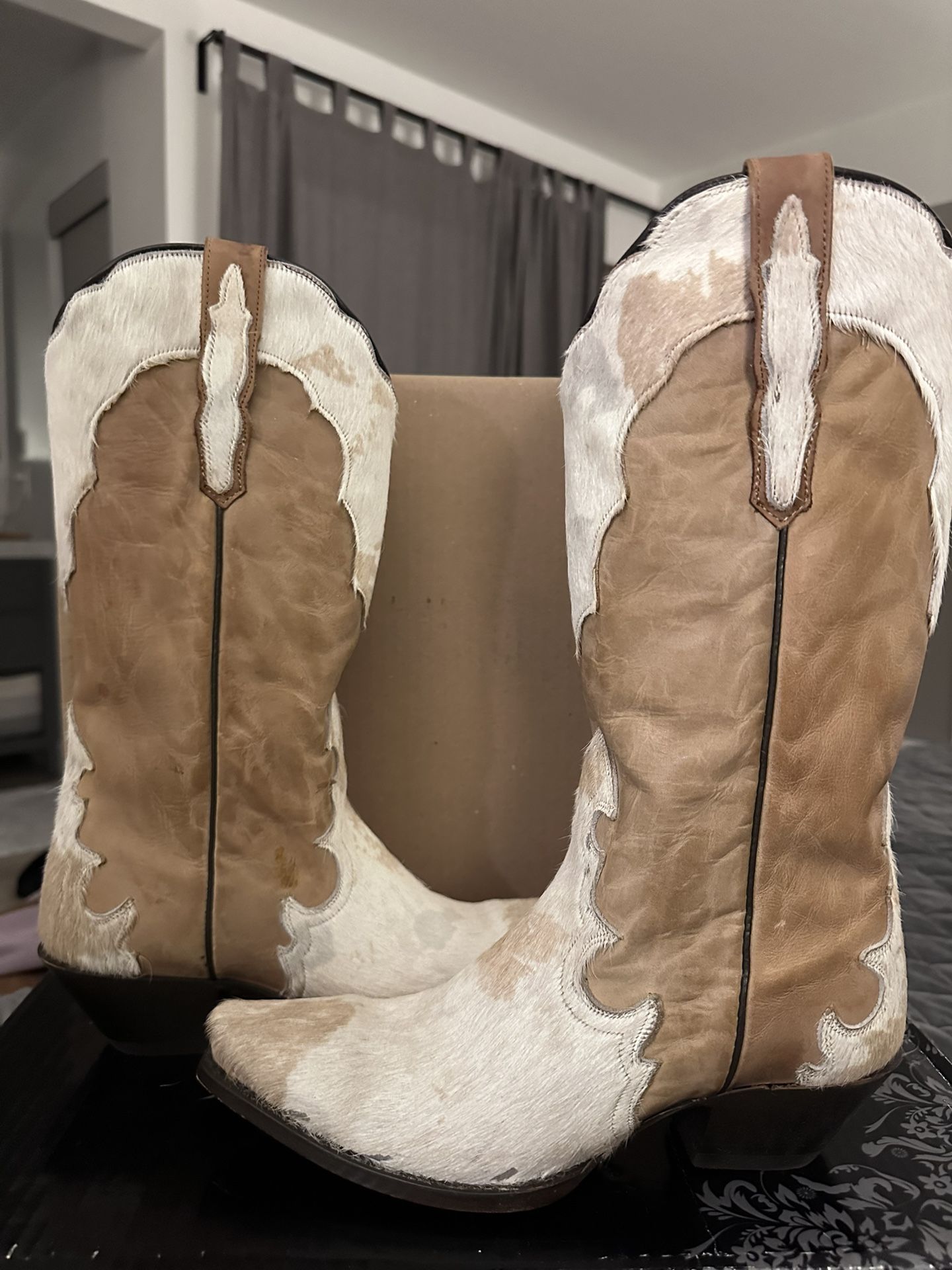 Ladies Size 8 Cowboy Boots, By Dan Post Cow print/cognac hair on ladies cowboy boot Got them for my mom and she only wore them once! (Not her thing/style)