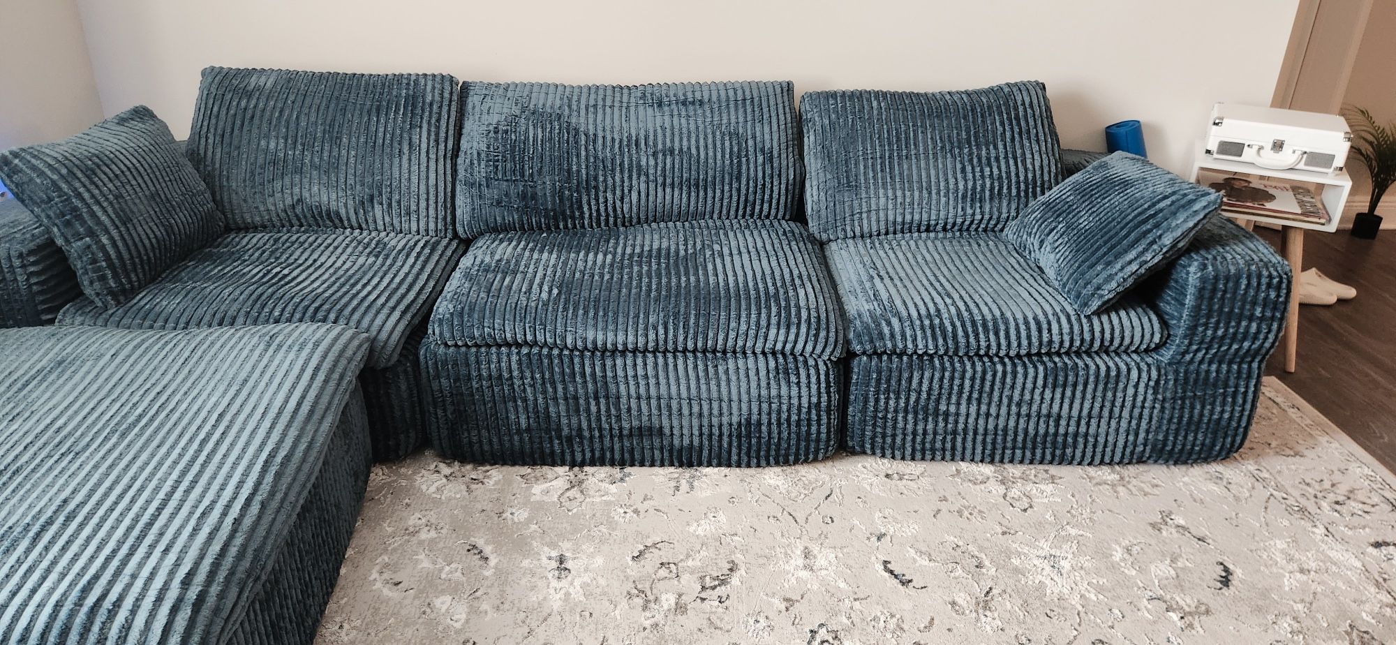 Just bought and opened this blue boneless sofa with moveable ottoman, but the color wasn't what I was looking for. Super comfy and soft, but surprisingly sturdy (you don't sink like a beanbag chair!). It's brand new in a non-smoking home, no pets allowed on furniture. Just not the right color for me. 118in L x 23 in H to armrest. Seats are 18in from floor to top of seat, back cushions also about 22in tall.