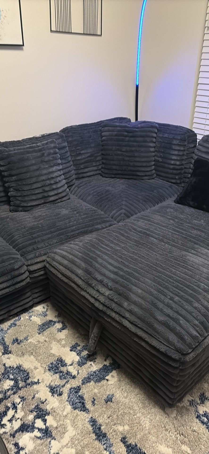 This sectional was purchased earlier this month, it’s not suitable for my apartment. So it hasn’t been used just assembled and unpackaged. Comes with 3 grey pillows and two black. That match the couches texture. COUCH CAN BE TAKEN APART AND PUT BACK TOGETHER EASILY. PICK UP ONLY
