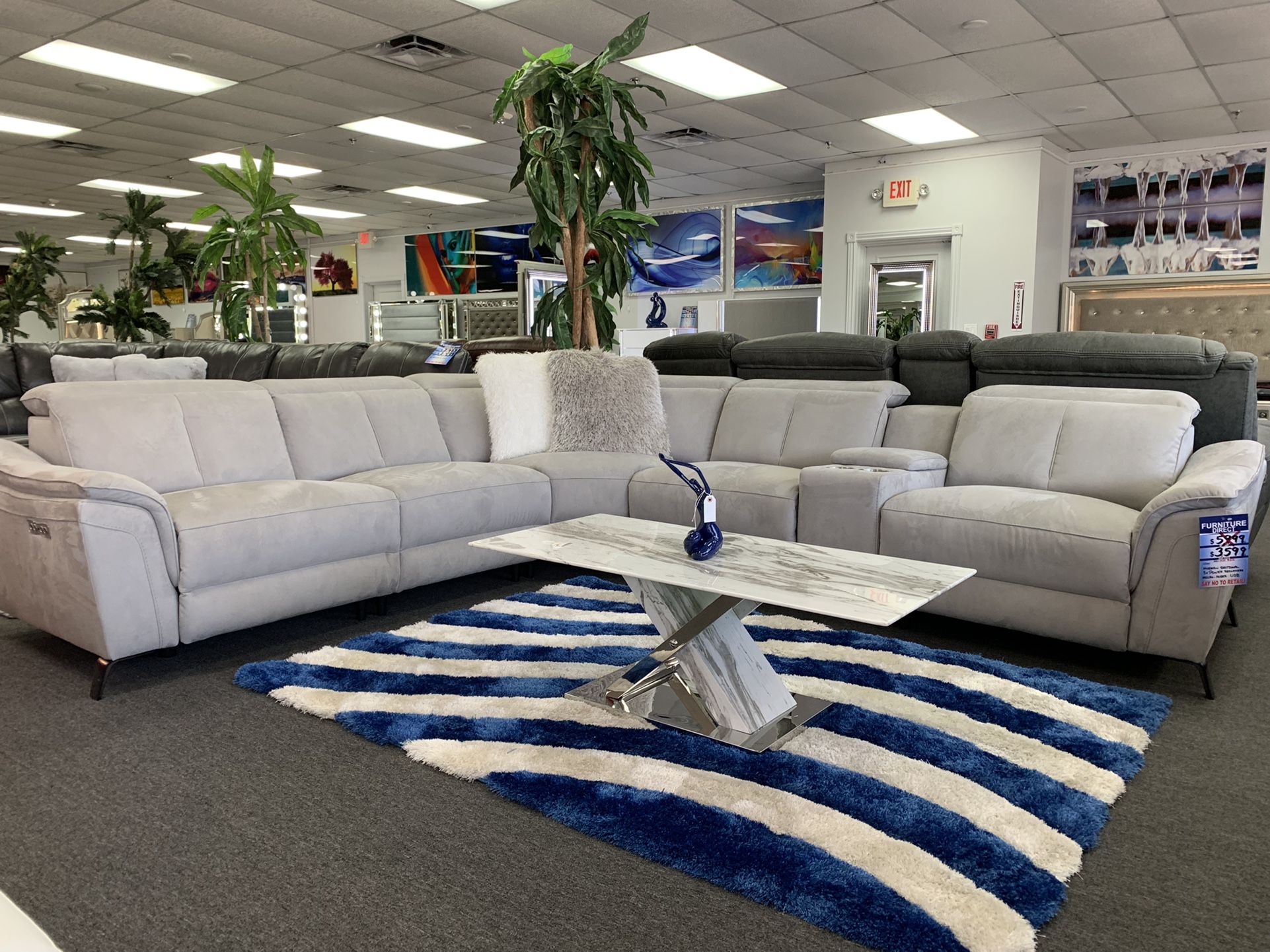 Gorges and Elegant Sectional comes in a lush gray Micro fiber with breath taking lines and looks! Set includes premium features like three power recliners, head and foot equipped with independent power motion to put you in limitless positions. Power USB and stainless steal cup holders. Set Regular Price: $4999 On Sale: $2999 (while supply’s last)