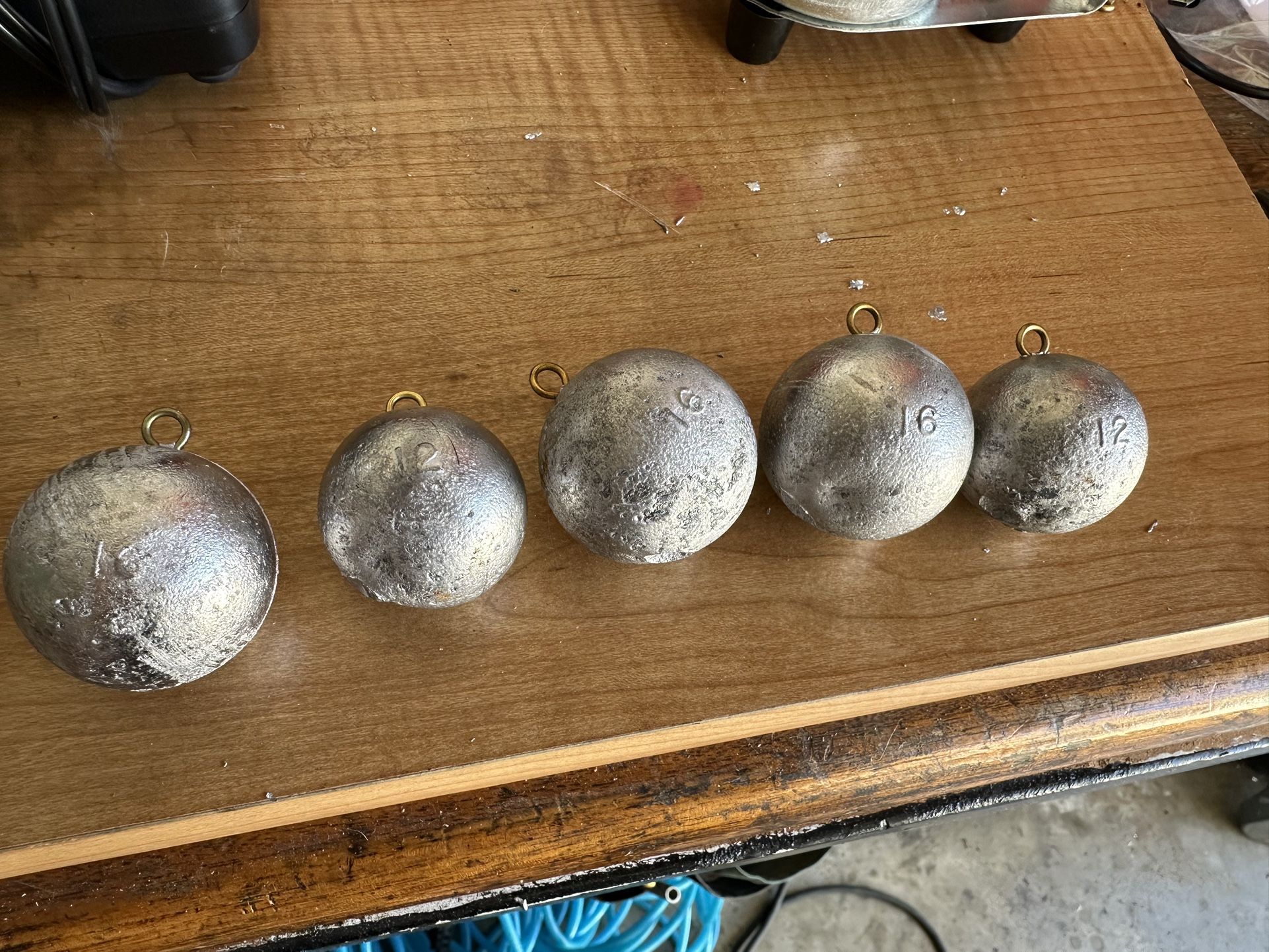 Cannon ball weights Shipping Available or local pick up Available in Packs of 5: Packs 5-16's 25.00 torpedo/cannon 5-12's 20.00 torpedo/cannon 5-10's 17.50 torpedo/cannon 5-8's 13.00 torpedo/cannon 5-6's 10.00 torpedo 5-5's 9.00 torpedo 5-4's 8.00 torpedo/surf weight 5-3's 7.00 torpedo 2lb bullet sinkers 13.00 each
