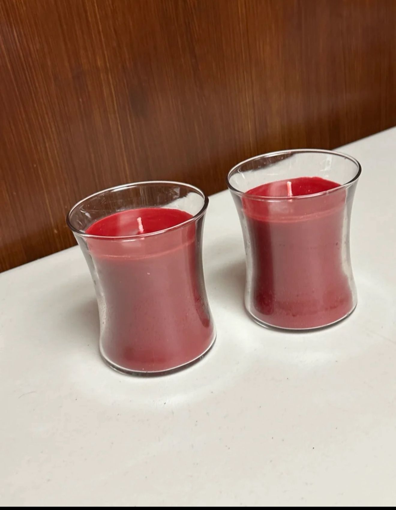 Enhance your home ambiance with this elegant red glass candle set. Perfect for adding a touch of warmth and style to any room. The wonderful scent of juicy apples baked in cinnamon, sugar, and vanilla. 60 hours of enjoyment from this soy-blend candle. 2 pieces 12 oz vol. 10 oz wt Unused, without original boxes 2 velas de manzana en vaso de vidrio, no tiene sus caja originales