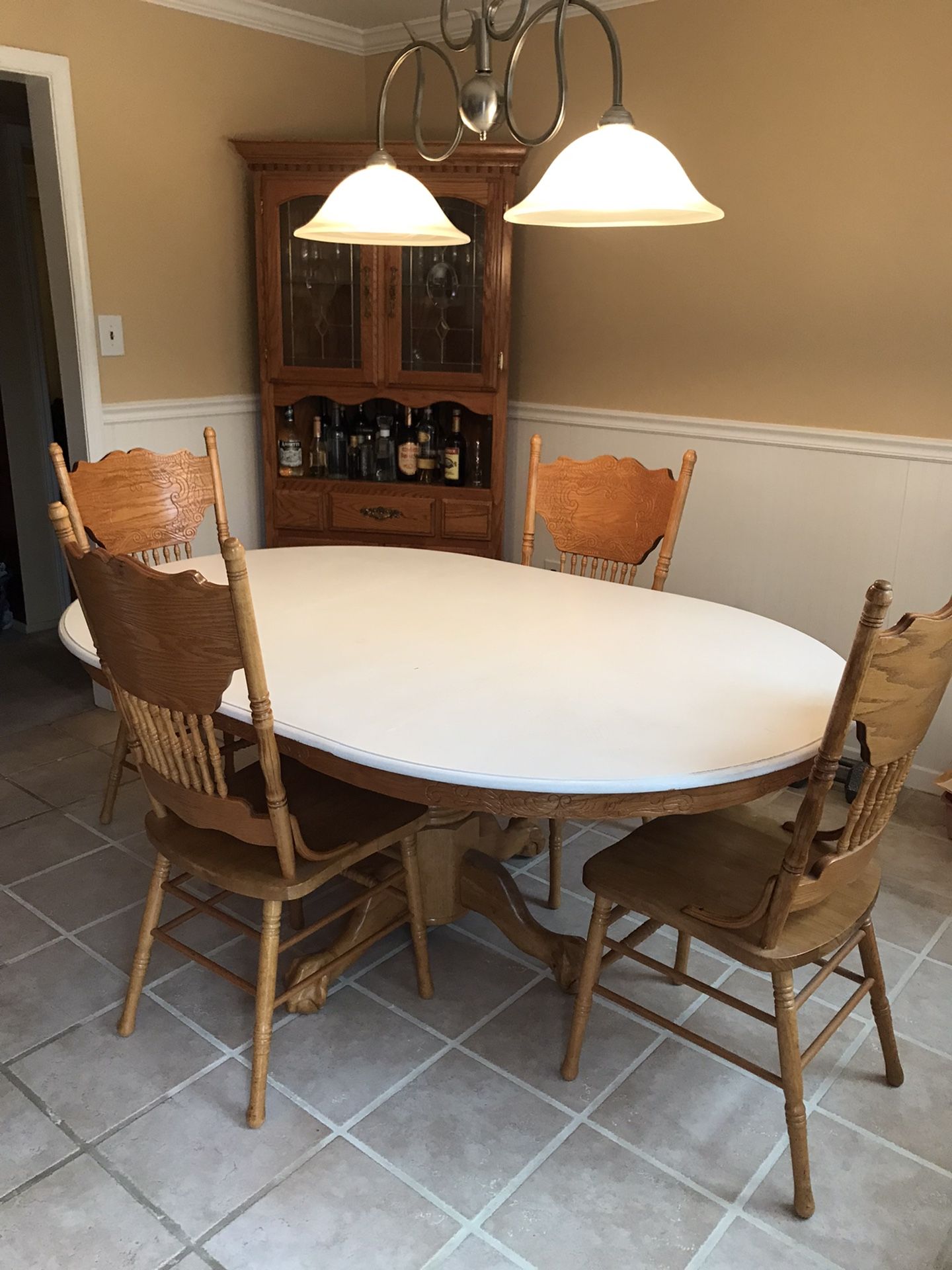 Solid oak table and 4 chairs. Table design and chair design match. 36 inch round. The leaf adds 24 inches