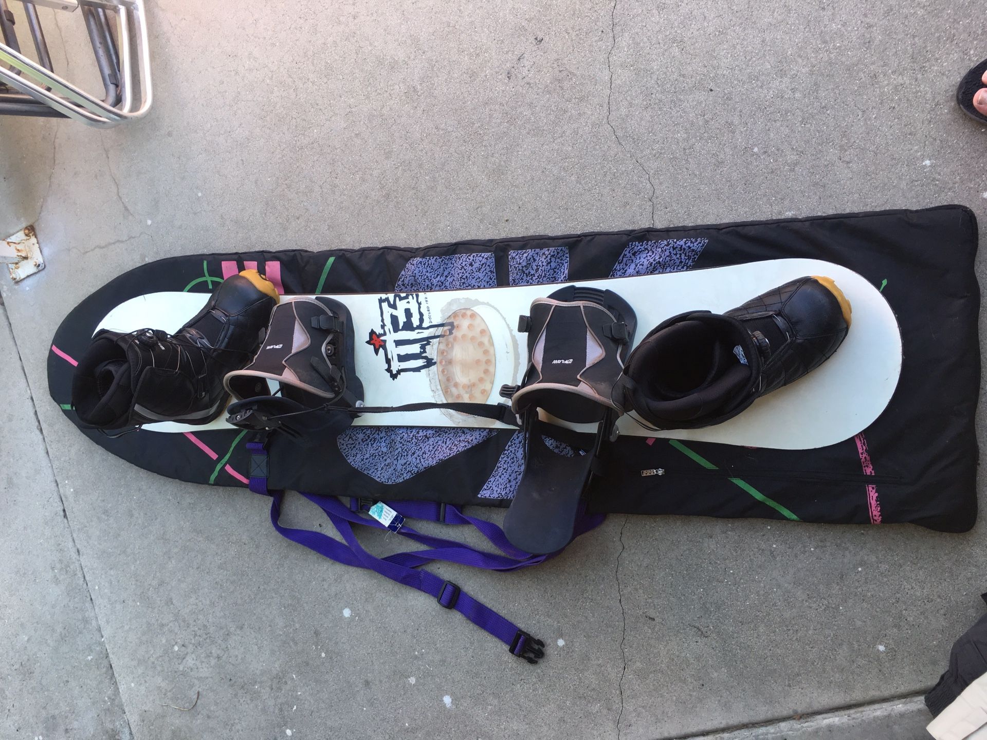 M3 snowboard. I’m 5’10. Size 12 Zuma cable tie system and retro 90s bag.