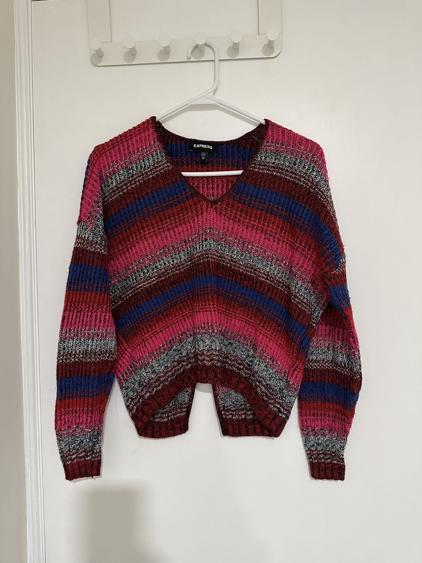 Express Cropped Sweatshirt Super cute crochet sweatshirt Beautiful colors ! Cute cut on back. Size XS Bundle items to save with shipping . Ship within 1 business day! Don’t forget to follow me. I have many items to post and will be trying to post items daily. Thank you!