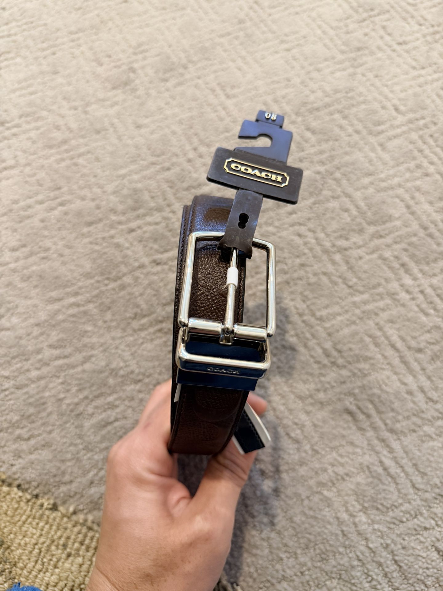 Authentic Coach men’s leather belt in mahogany/brown with signature “C” embossed pattern and silver-tone buckle. Style F55158 (MAH). Tag shows MSRP $150. Includes Coach dust bag (see photos). Great everyday belt for jeans or dress casual.