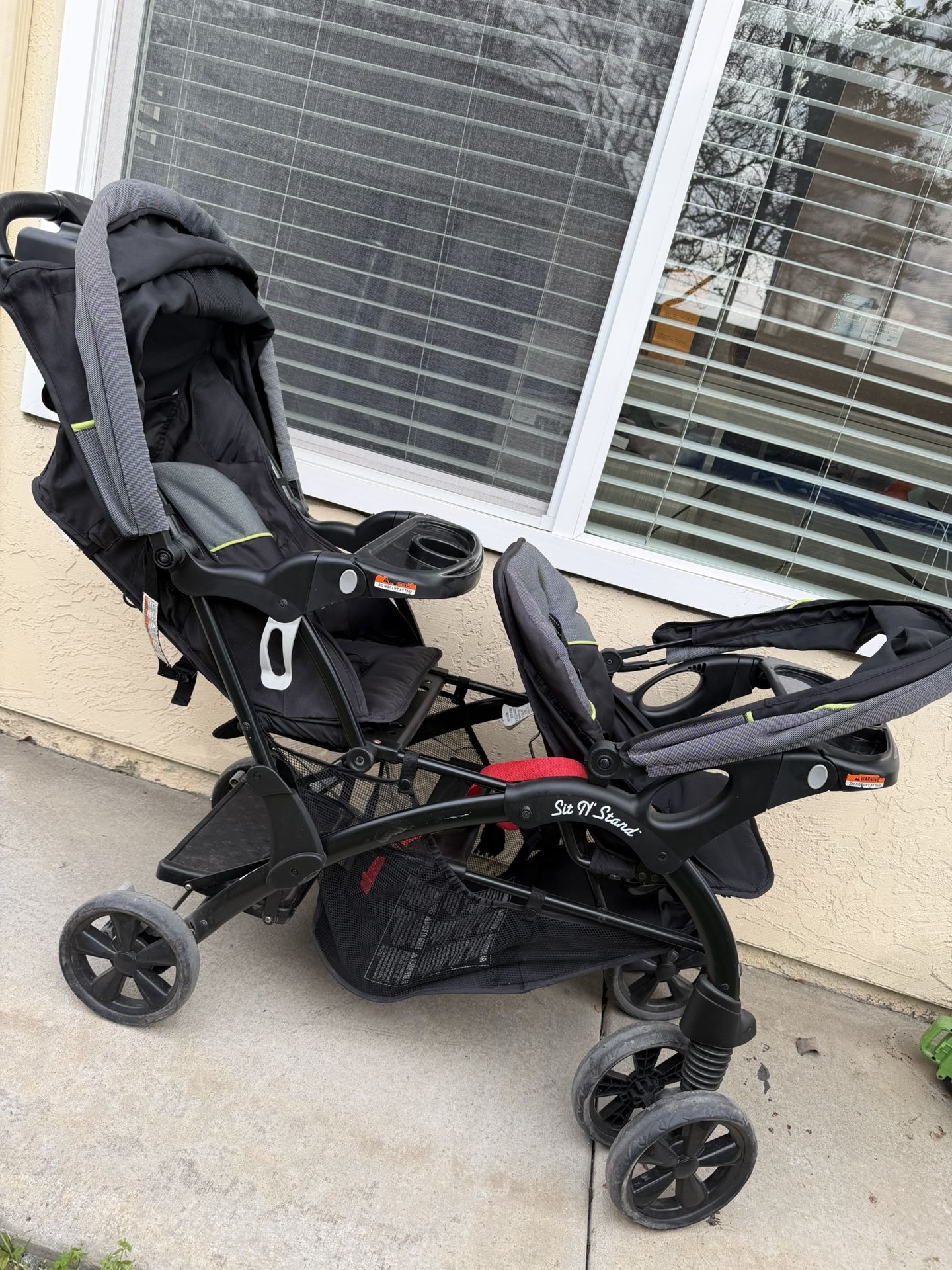 Works great Super awesome baby and child, together. Was $200 Selling for half the price Discover the versatility and convenience of Baby Trend's Sit N Stand Double Stroller, ideal for families with two young children. Designed for comfort and flexibility, this stroller accommodates two kids in seated positions or lets one child stand. It's compatible with most Baby Trend car seats. The stroller's features include child trays and sun canopies, ensuring a comfortable and enjoyable ride. With a quick one-hand fold mechanism, it offers hassle-free operation for parents. Included is a parent tray with cup holders and additional storage space. Enjoy effortless transportation due to its compact fold design. • Children can sit in the front and rear seats or stand on the rear platform • Parent tray with 2 cup holders and covered storage compartment • One-hand fold makes it fast and easy to use • Both seats feature a 5-point child restraint safety harness • Removable/swing away child trays accept infant car seats • Removable rear seat converts stroller to traditional Sit N' Stand • Accepts most Baby Trend® Car Seats including Ally, Secure, Flex-loc Infant Car seats