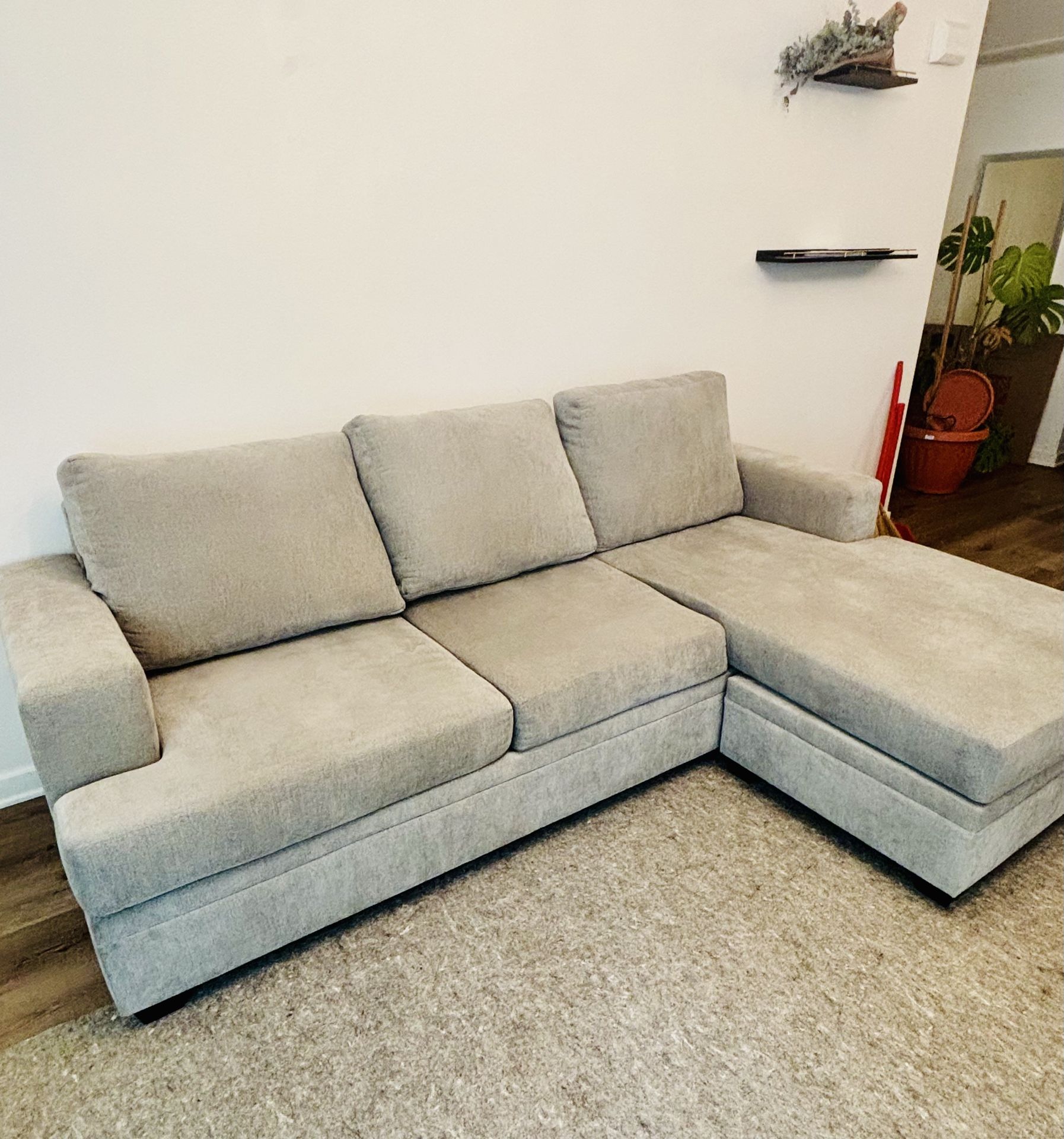 Modern gray sectional couch from Living Spaces in excellent condition. About 3 years old and very well maintained. • No stains, rips, or odors • Cushions are firm and hold shape (no sagging) • Comfortable chaise lounge on right side or can go on left side • Neutral color matches any decor Perfect for apartments or living rooms. Only selling due to move. Did not fit in U-Box. Pickup required.