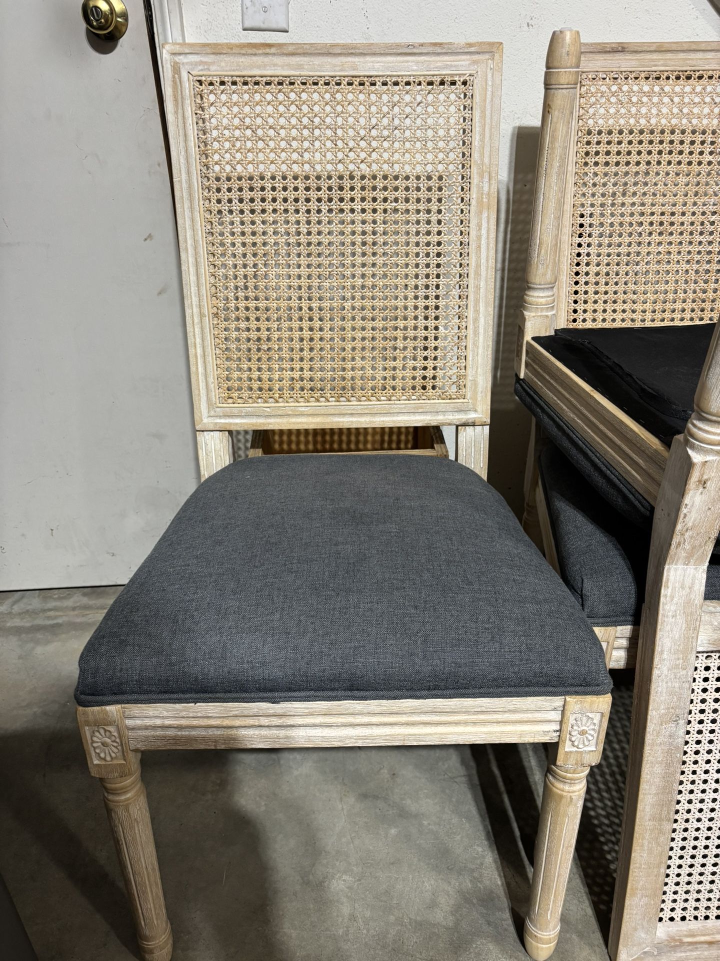 These chairs have good cushion and are in good used condition. Fabric is medium gray color and wood is light beige with whitewash finish. Any questions let me know, thanks! $125 for all.