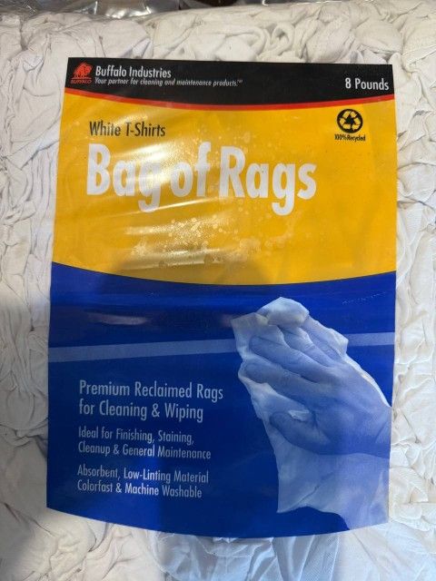 Premium reclaimed white T-shirt material 8-pound bag Absorbent, low-lint, colorfast, and machine washable 100% recycled material Ideal for garages, workshops, painting, auto detailing, and home cleaning
