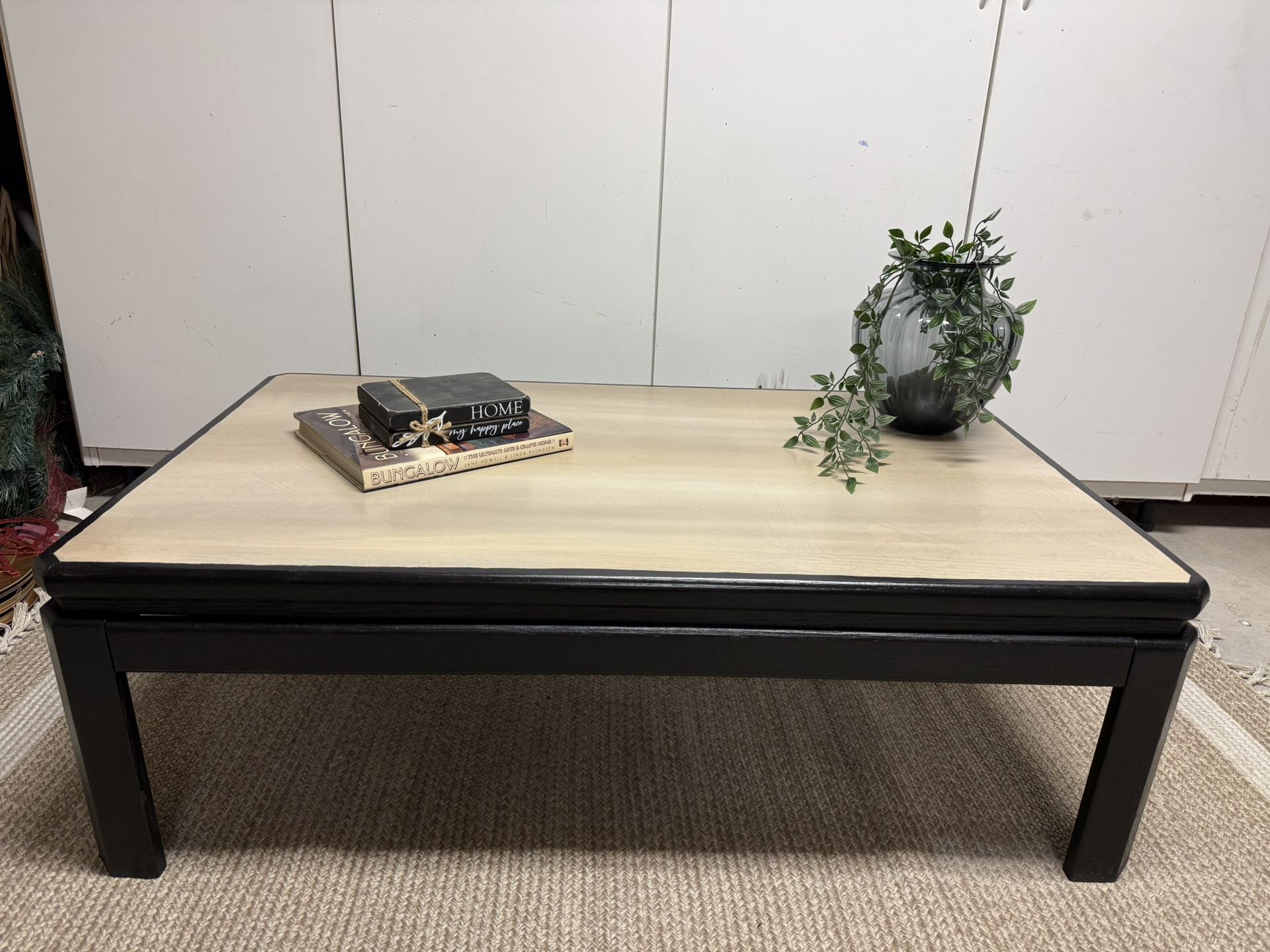 This is solid wood, has been refinished. Painted in a gloss black and the top is refinished with a wash look of different light colors. Sealed with polyacrylic for protection. Pick up in Fair Oaks 50L x 30W x 16H