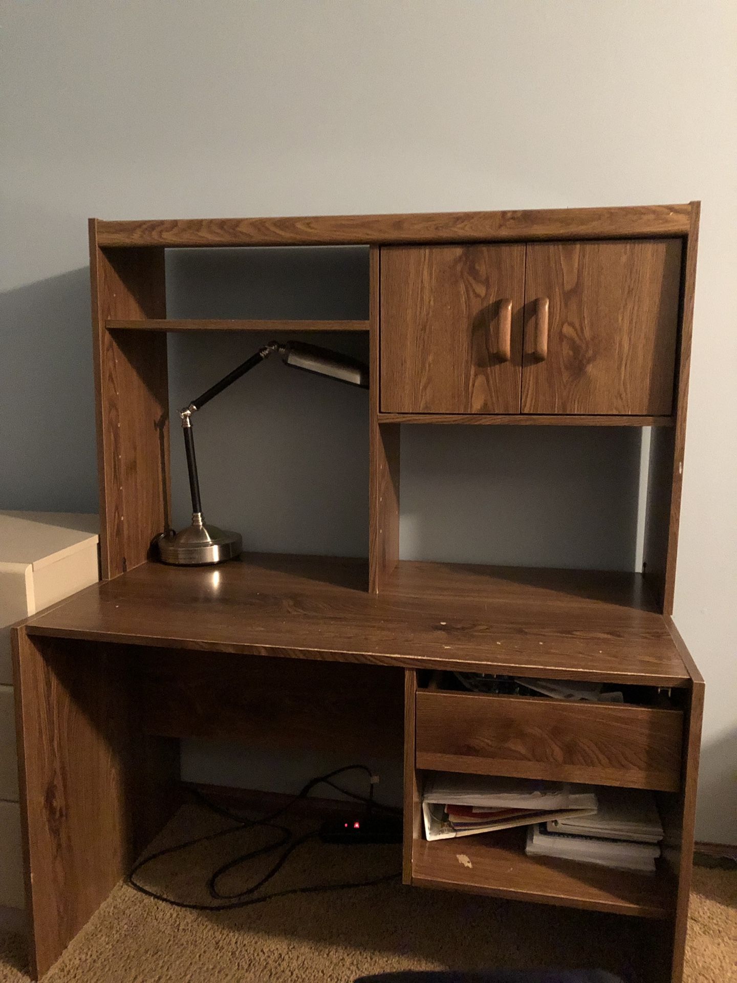 Nice desk. Real wood. There are some marks which are in pics. Lots of storage. Perfect for college student Dimensions: 43”L 23”W 55””H