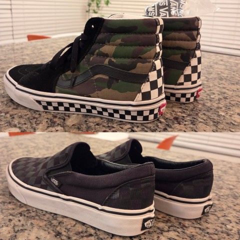 2 pairs, both size 6. Checkered and camouflage vans are custom and worn only 2x. Other lightly used. Both great condition. One set of brand new vans laces Both pairs for $75