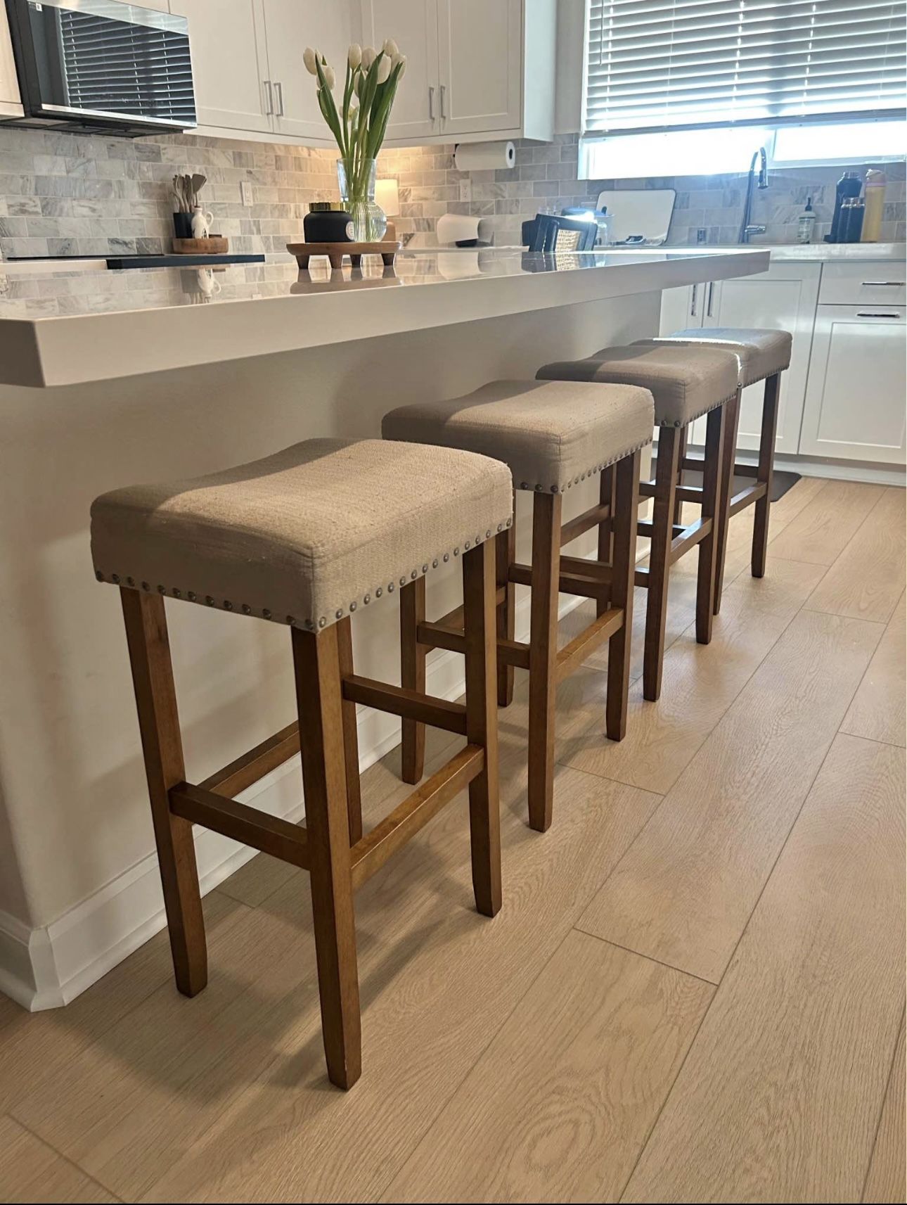 Selling a set of 4 counter-height bar stools (28 inches tall). These are sturdy, solid wood stools with upholstered seats in a neutral beige fabric that works beautifully with most kitchen styles. Please note that the wood is in great condition but that there is some pilling on the seat cushions but they are clean and stain free. Details: • 28” seat height (ideal for standard kitchen counters) • Solid wood legs with footrest support • Neutral upholstered cushion with nailhead trim • Very sturdy and comfortable • Clean and well cared for They’ve been a great fit at our kitchen island. Asking $200 I am located in east county and if they are still listed then they are still available