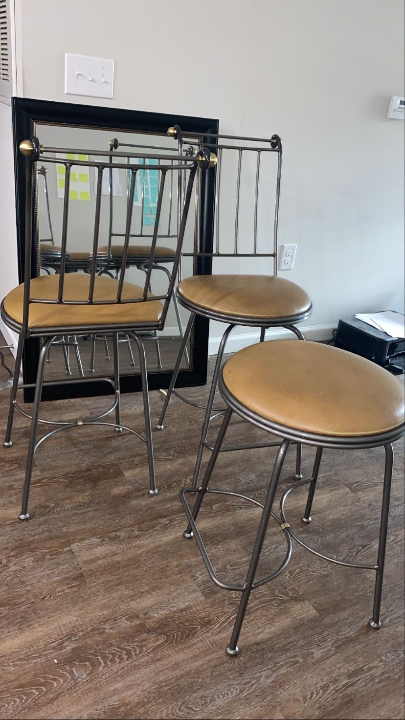 These are really heavy ( made out of real durable material ) not just any flimsy bar stools. I was using them inside for my kitchen island. Would be nice patio furniture / sun room as they are weather proof and won’t be blown over. Comfy cushioned seat with supported back (2) comfy cushioned seat with no back (1) entire set is (3)