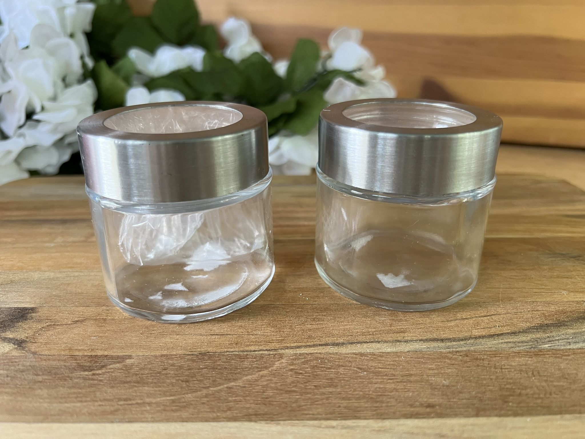 Two glass jars with silver twist off top. From Hobby lobby never been used.