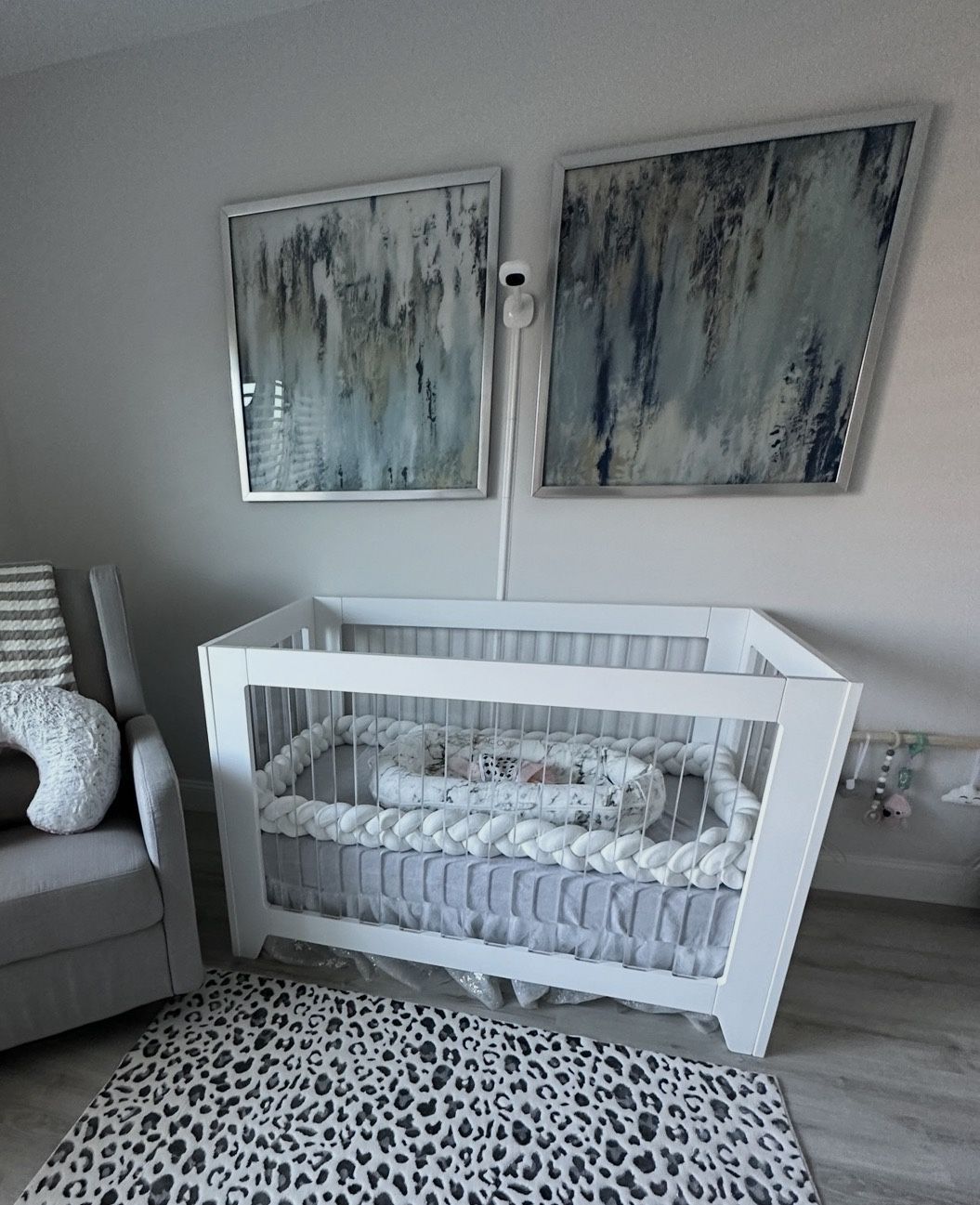 Selling a like-new 3-in-1 convertible crib with mattress, white braided crib bumper, and 3 Pottery Barn crib sheets (white, gray, and pink clouds with birds). My baby slept in this crib fewer than 10 times for naps and ended up sleeping in my bed instead—so this set is essentially brand new. ✔️ Clean, well-maintained ✔️ Smoke-free, pet-free home ✔️ High-quality, stylish, and ready to use Perfect for anyone looking for a beautiful crib set without paying full retail.