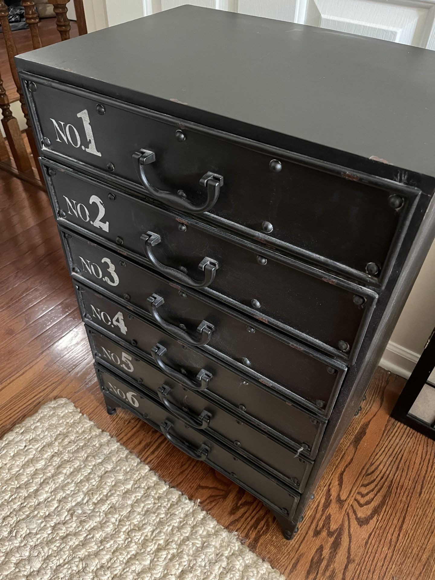 World market metal end table. Excellent condition, as barely used. Shabby chic finish. Lots of storage space in its 6 drawers. Would do well in displaying a coffee maker (w/ pods/filters inside). Or use in an office (for storing paper/ other desk items). $150.