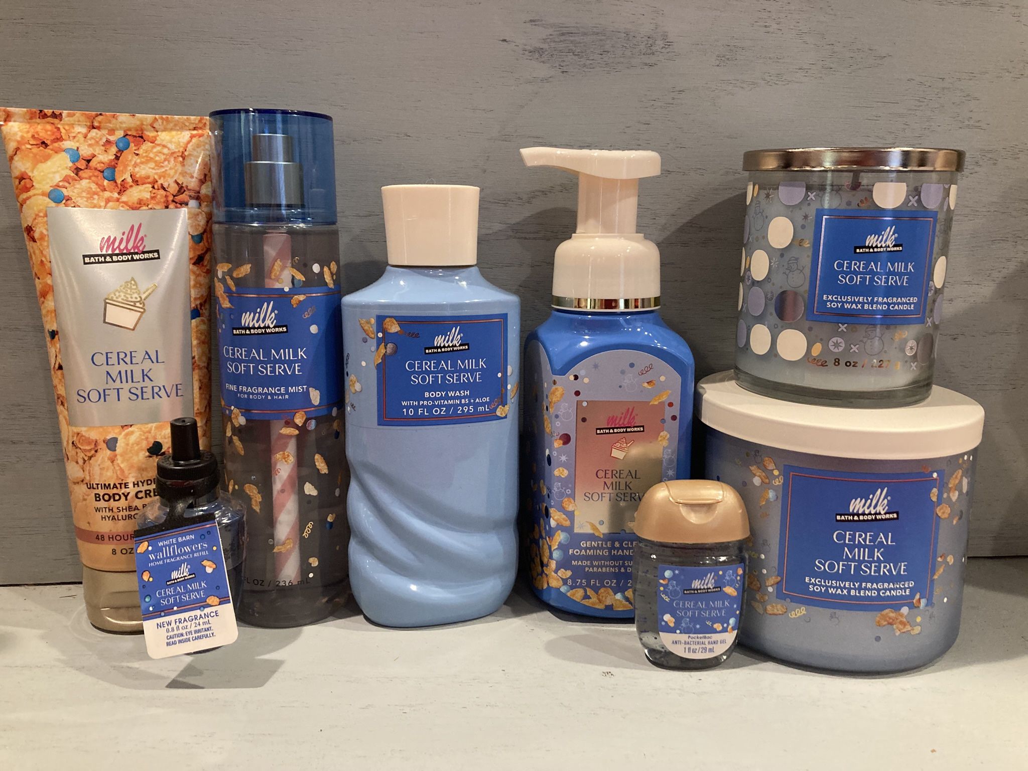 Cereal Milk Softserve collection includes a full size body cream, fragrance mist, and shower gel. Foaming hand soap, a wallfower, hand sanitizer, single wick candle and triple wick candle. This is a limited collection and sold out in stores and online. $60