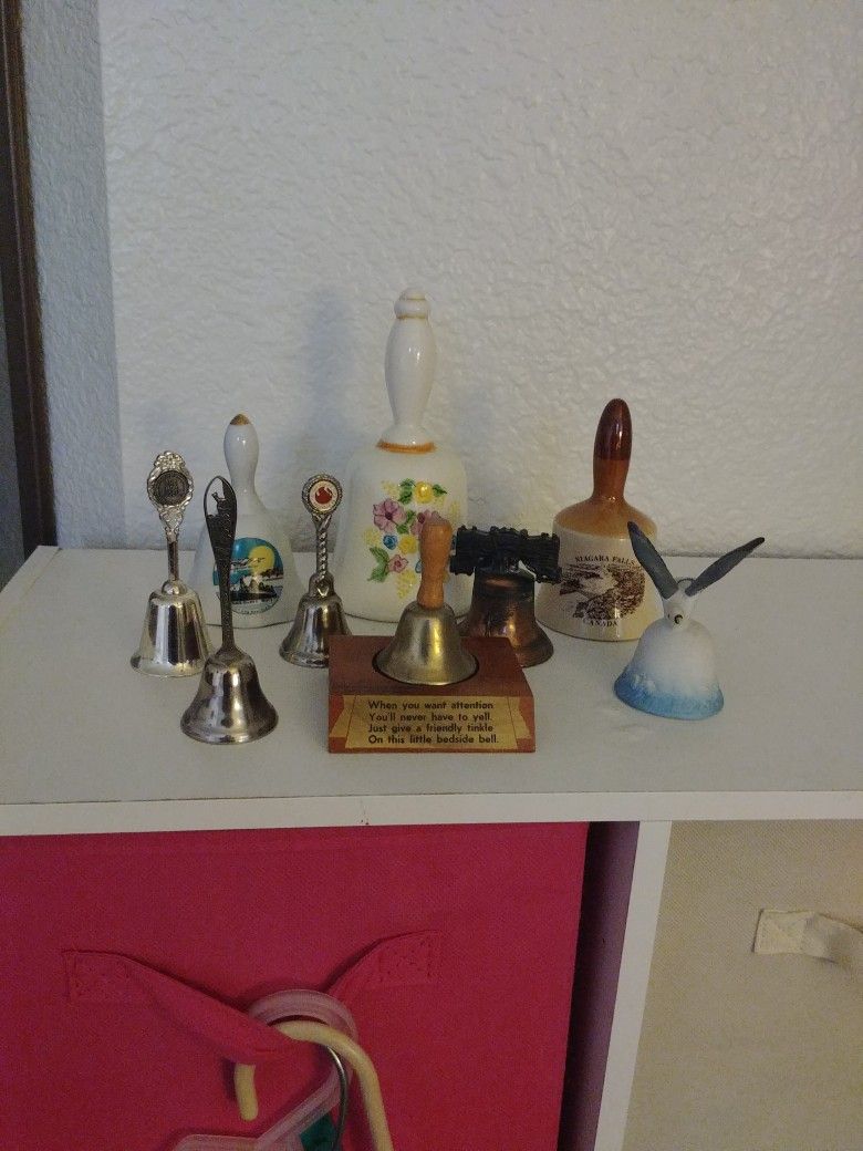 Collector's 10 bells in all. Mackinac Island 1982 World's Fair (Knoxville, TN) R.M.S. Queen Mary Niagara Falls, CAN Mob Museum Liberty Bell Porcelain Sea Gull Ceramic Bell w/flowers Desk Bell-When you want attention... CASH ONLY, PICK UP ONLY