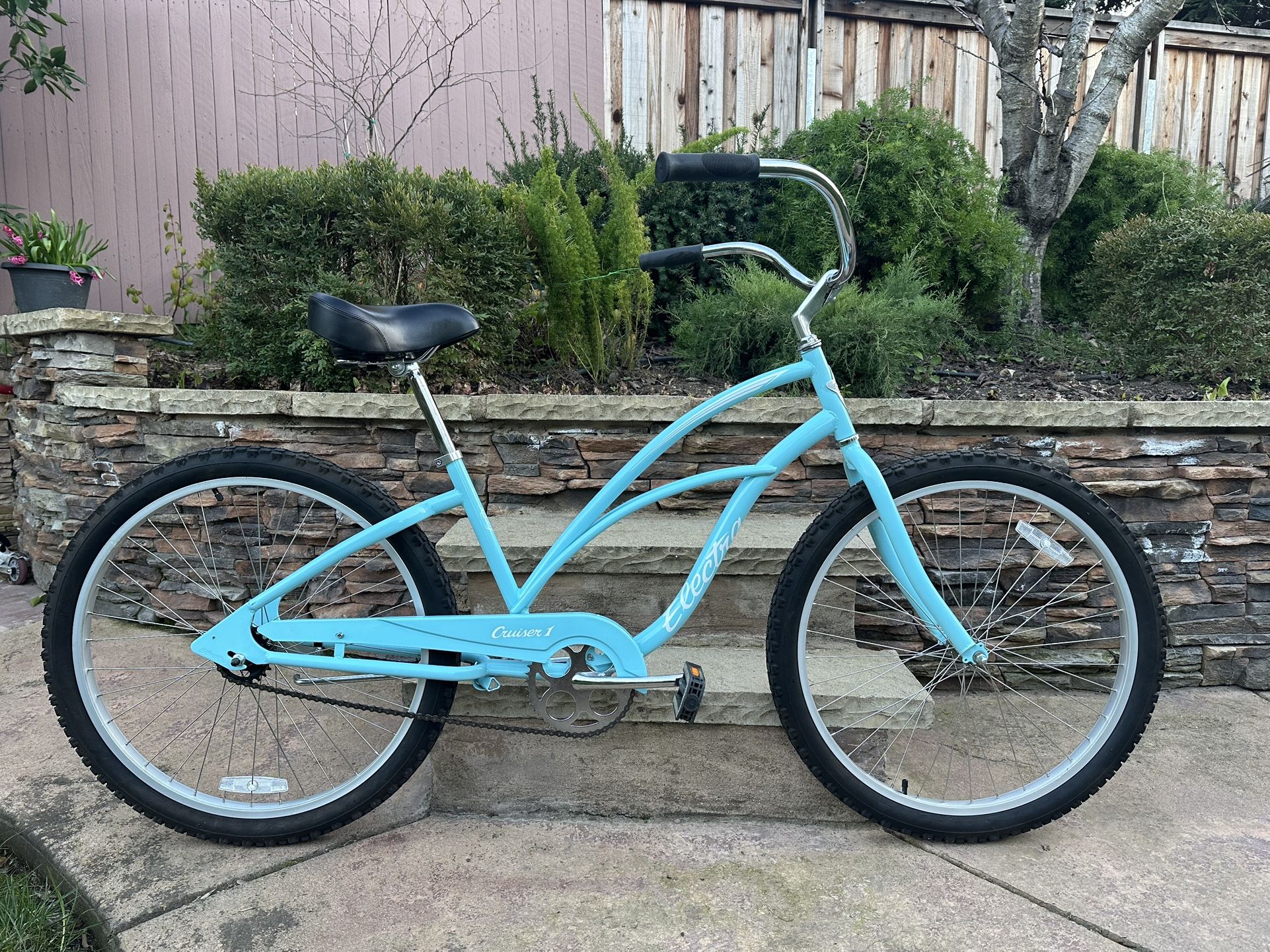26" Electra Cruiser 1 Step-Through Bike – comes “LIKE NEW” condition with ALL original parts. Looks nice in aqua blue color and is suitable for riders 5’1”-5’8”. The Electra Cruiser 1 is a simple, durable bike perfect for a sun-soaked ride on the boardwalk or cruising the streets to your favorite places. The single-speed Electra Cruiser 1 features patented Flat Foot Technology® and custom swept back handlebars for a comfy, upright riding position. A sturdy cantilevered frame, alloy rims and stainless-steel spokes will keep you riding in style for years to come. SPECIFICS: Frameset Frame: Classic hi-ten steel w/patented Flat Foot Technology® Fork: Steel unicrown Wheels Front hub: Steel 36h Rear hub: Coaster 36h Rims: Alloy Tires: RetroRunner 26×2.125" Drivetrain Crank: Classic steel one piece w/44t chainring Bottom bracket: 9-PC loose ball Cassette: 22t Chain: KMC S1 Pedals: Resin platform w/non-slip tread Components Saddle: Electra comfort w/elastomer springs Seatpost: Classic steel pillar Handlebar: Electra café Grips: Comfort kraton Stem: Alloy classic Headset: 1" steel threaded Brakeset: Coaster brake Accessories Kickstand: Steel integrated Front basket attached Extras: Painted chain guard and stainless steel and anti-rust hardware Weight Weight: 15.88 kg / 36 lbs