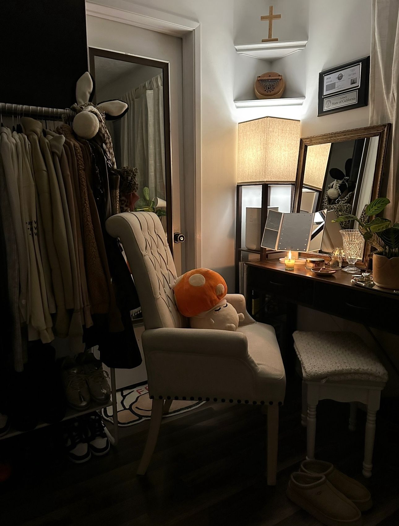 Nice cream colored chair. It’s a dining chair but I used it in my room. Just don’t really have space for it. It’s comfy to sit in