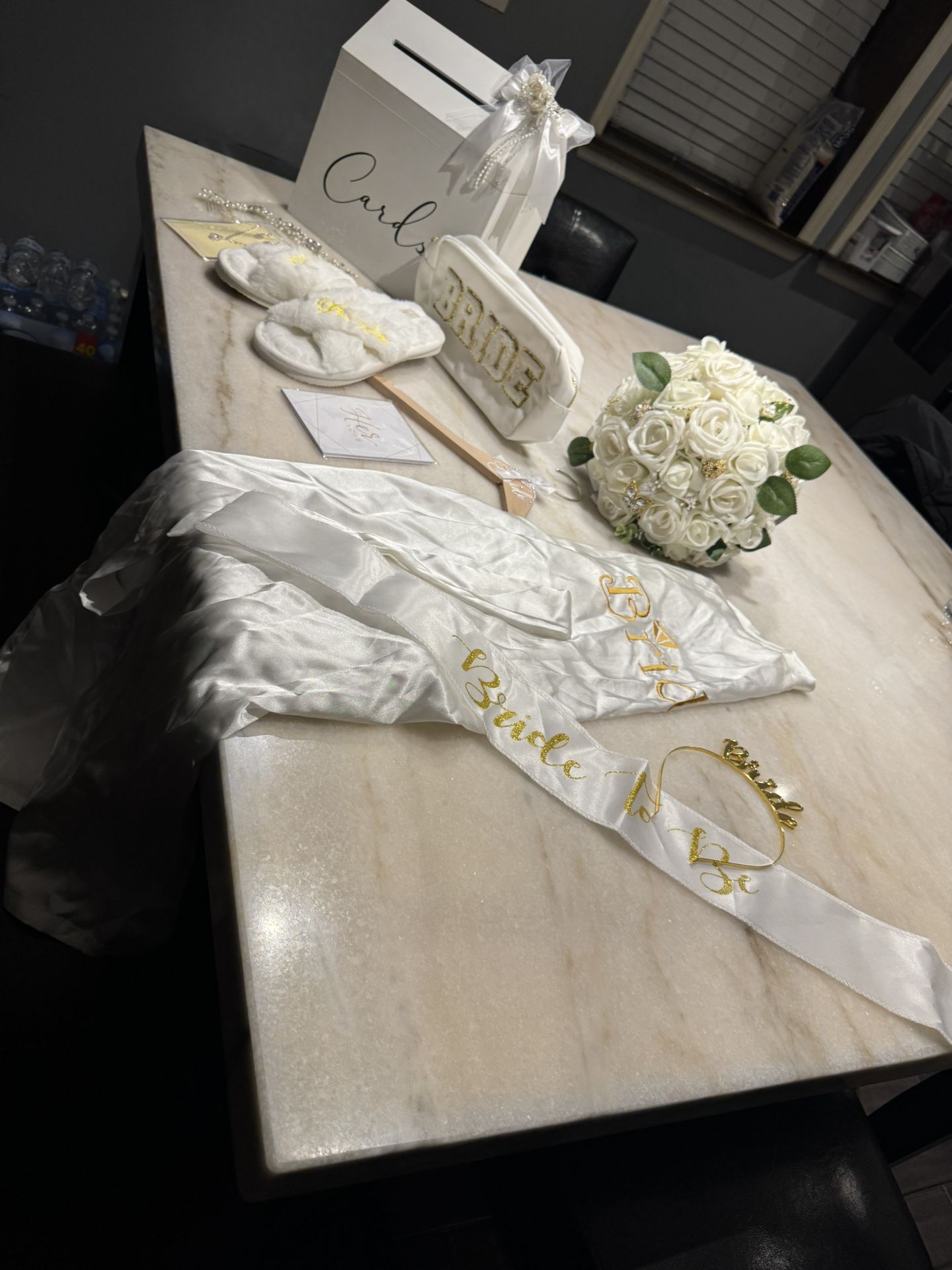 Everything is new Bridal bouquet,bride robe,bride hanger,bride slippers,bride makeup bag,Cards box,her vows his vows,necklace,bridal hair vine pearl crystal,gold bride tiara,bride to Be sash.. I also have Short sequin bride to be dress size Large only worn once for a photoshoot, like new I’m selling everything for $225 or best offer