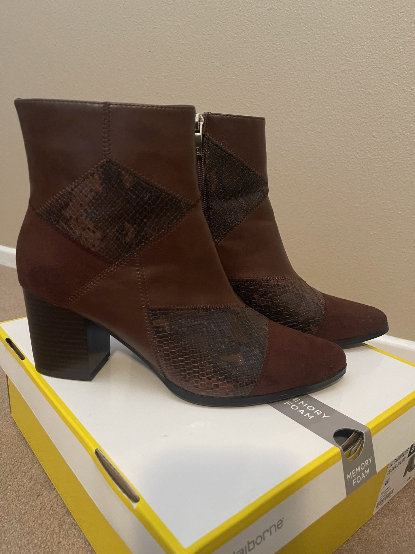 Brand: Liz Claiborne Color: Cognac Brown US Shoe Size: Women’s 8 1/2 Style: Ankle Boot Pattern: Solid/snake Heel Height: 3 in Heel Style: Chunky Heel Toe Shape: Almond Toe Shoe Shaft Style: Ankle Features: Memory Foam Comfort Closure: Zip Condition: New in Box, tried on but not used!
